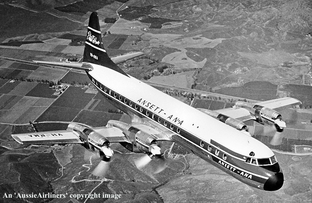 VH-RMA. Ansett-ANA - in the original livery at Melbourne Essendon Airport, October 1959. (B. Colledge Copyright Image 1808-320.) |
