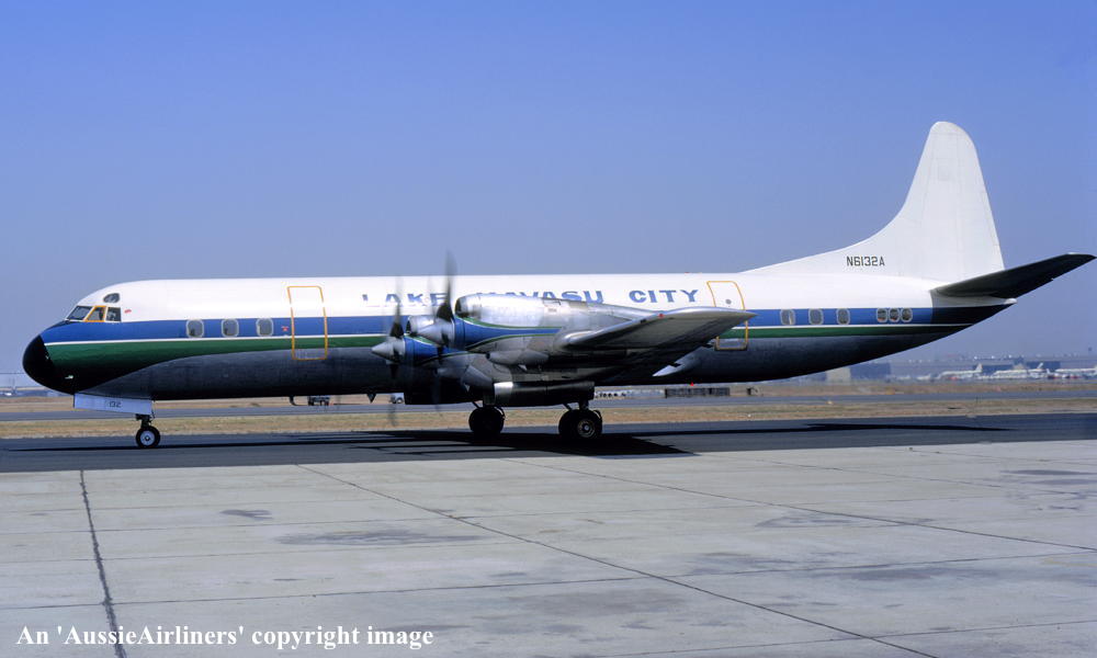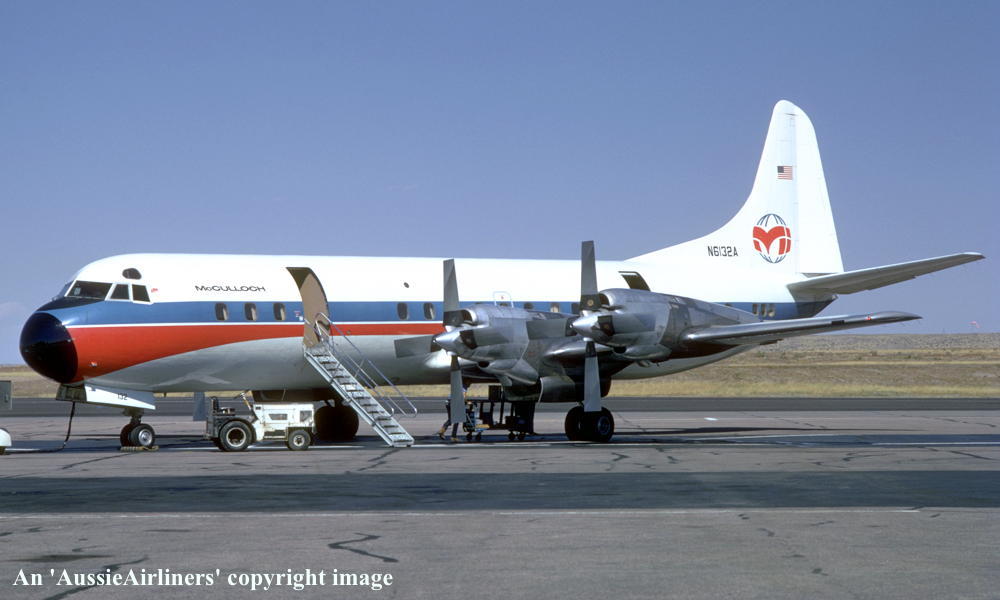 This aircraft was ordered new by American Airlines - ? First flown - February 12, 1960 Entered onto the United States Aircraft Register as N6132A - ? Accepted by American Airlines at Burbank, California - February 19, 1960 The aircraft was named 'Flagship Richmond' Entered the Lockheed LEAP program as 'LEAP #34 AAL-4' - December 02, 1960 Modifications completed - January 03, 1961 Sold to McCulloch Properties Inc - February 06, 1969 Delivered to McCulloch International Airlines - February 13, 1969 It was operated by McCulloch International and Lake Havasu City Converted to L-188AF freighter by Lockheed Aircraft Services - August 1975 Sold to Ansett Airlines of Australia - August 23, 1975 It arrived at Melbourne (Tullamarine) in the basic McCulloch livery without titles - August 23, 1975 Flight crew: Captains P. Legge, M. J. Read; F/E F. Cox Entered onto the Australian Aircraft Register as VH-RMG - August 27, 1975 Registered to Ansett Transport Industries (Operations) Pty Ltd, Melbourne Operated its first freighter revenue service Melbourne (Tullamarine) - Launceston - August 28, 1975 Operated its final freighter service Perth - Melbourne (Tullamarine) as AN451 - May 05, 1978 Withdrawn from service having flown 4,349 hours and 3,023 cycles with Ansett Cancelled from the Australian Aircraft Register - May 25, 1978 Sold to Evergreen International - May 30, 1978 Departed Melbourne as 'VH-PTQ' on the ferry flight to the United States routing via Auckland - May 30, 1978 Entered onto the United States Aircraft Register as N2251A - June 1978 Reregistered N5538 to Evergreen International - July 12, 1978 Cancelled from the United States Aircraft Register - January 1983 Sold to Argentine Navy and converted for maritime patrol duties It was allocated the Argentinian Military markings '6-P-101' This aircraft was destroyed whilst landing at Almirante Zar Area Naval (Trelew) - September 20, 1989 Whilst on approach to land the starboard undercarriage leg failed to lower On landing the starboard wing struck the ground and was torn off The starboard props severed the forward fuselage as the aircraft swung through 180 degrees It was destroyed by fire - 3 crew severly injured but 20 other naval ratings escaped uninjured |