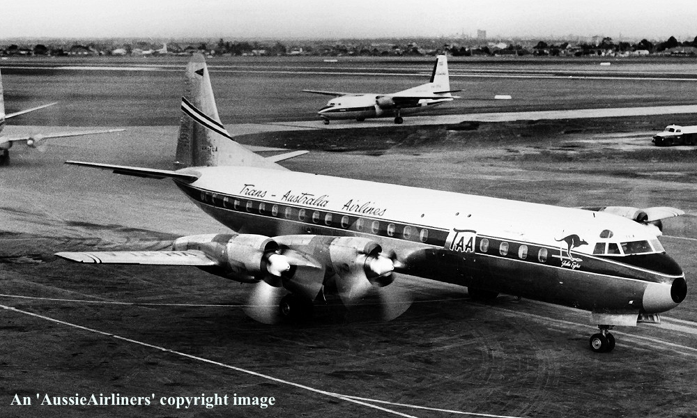 VH-TLA. TAA Trans-Australia Airlines - 'John Eyre' in the original livery at Melbourne Essendon Airport, June 24, 1959. (R. N. Smith Collection Copyright Image 1808-526.) |