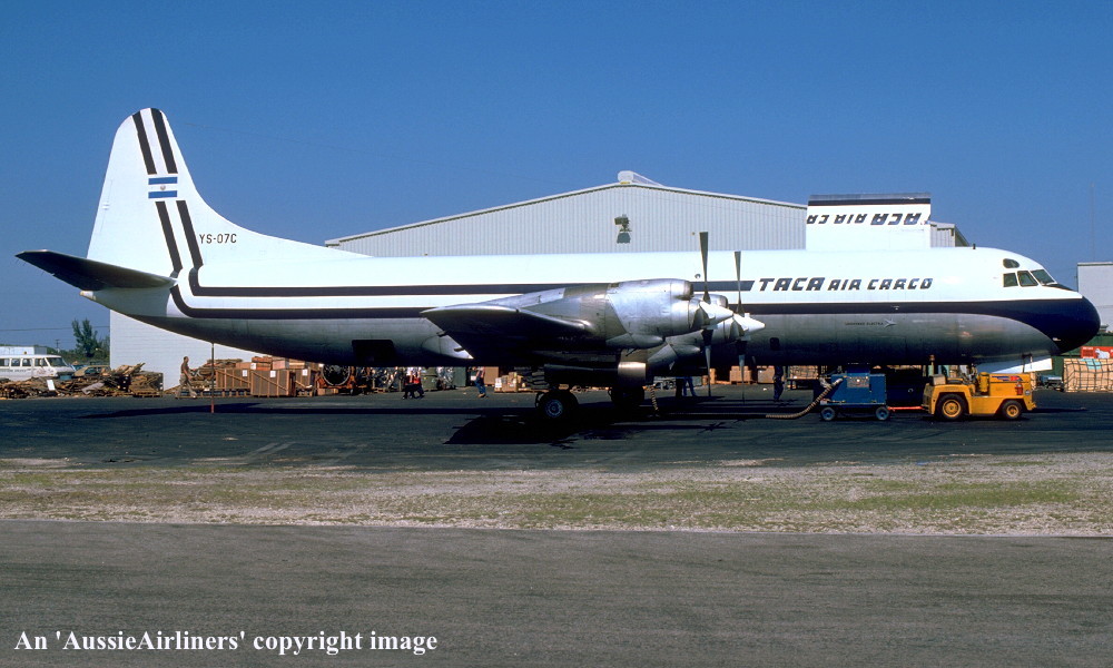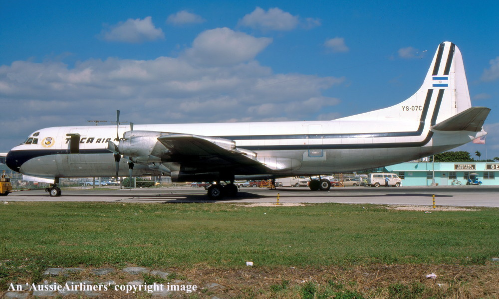 YS-07C. TACA Air Cargo - in the standard livery at Miami Airport, June 1977. (R. N. Smith Collection Copyright Image 1808-221.) |