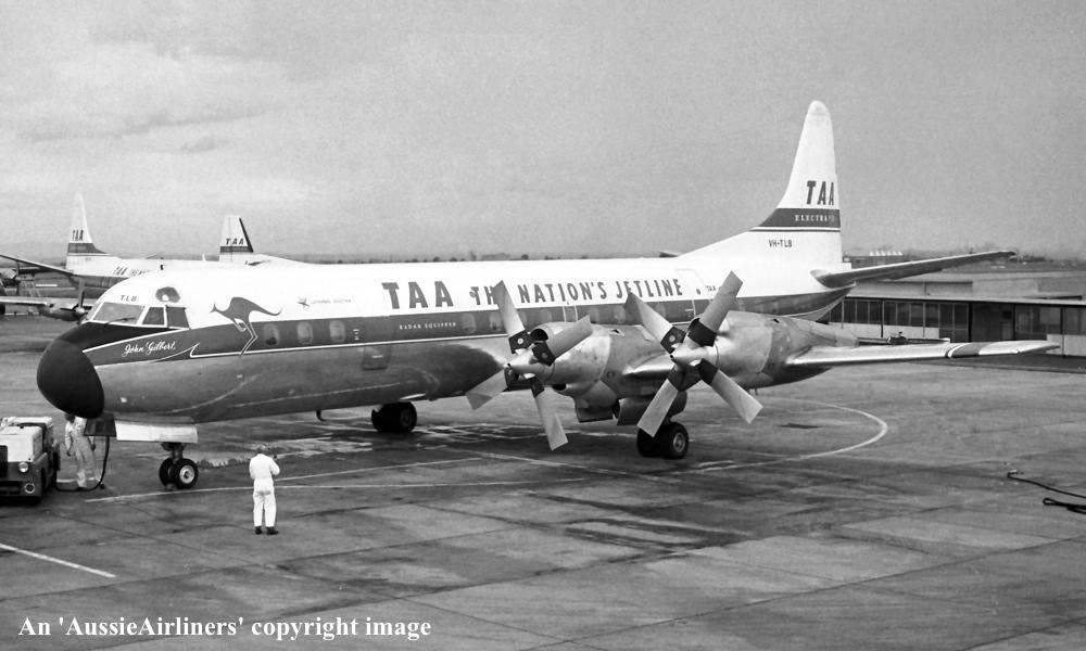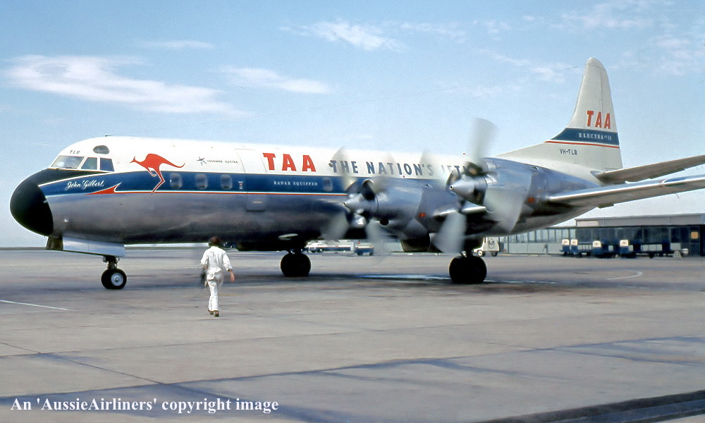 VH-TLB. TAA - 'John Gilbert' in the revised livery at Brisbane Airport, August 1971. (R. N. Smith Collection Copyright Image 1808-217.) |