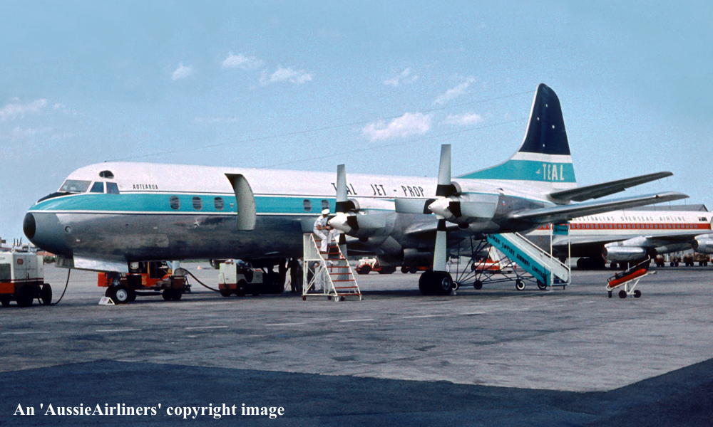 ZK-TEA. TEAL - 'Aotearoa' in the original livery with 'Jet Prop' titles at Sydney Kingsford Smith Airport, circa 1964. (R. N. Smith Collection Copyright Image 1808-759.) |