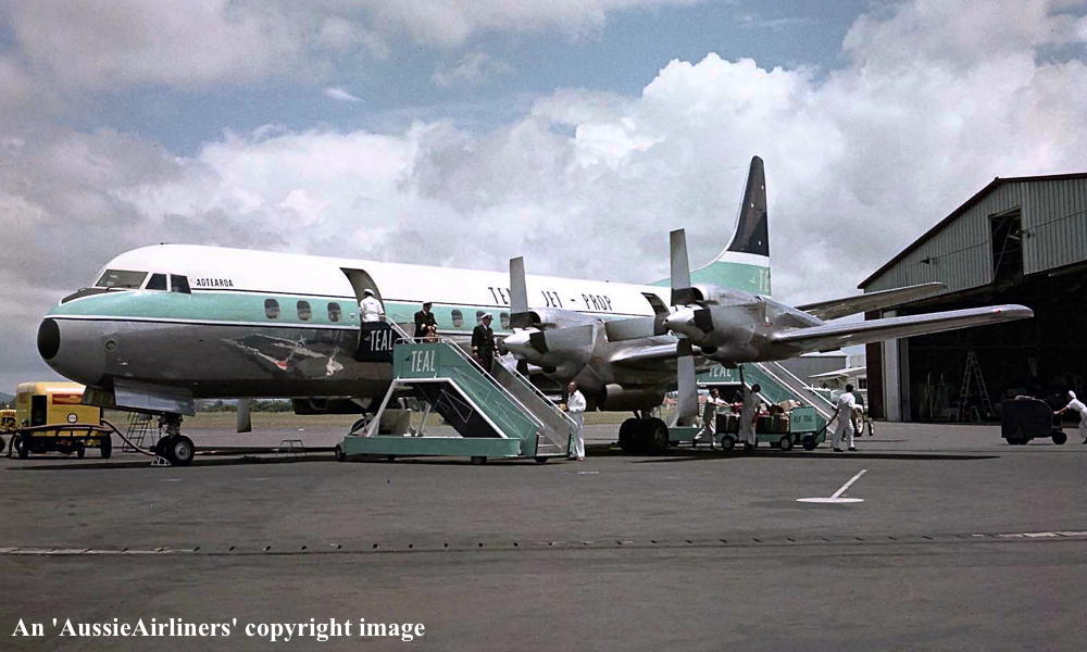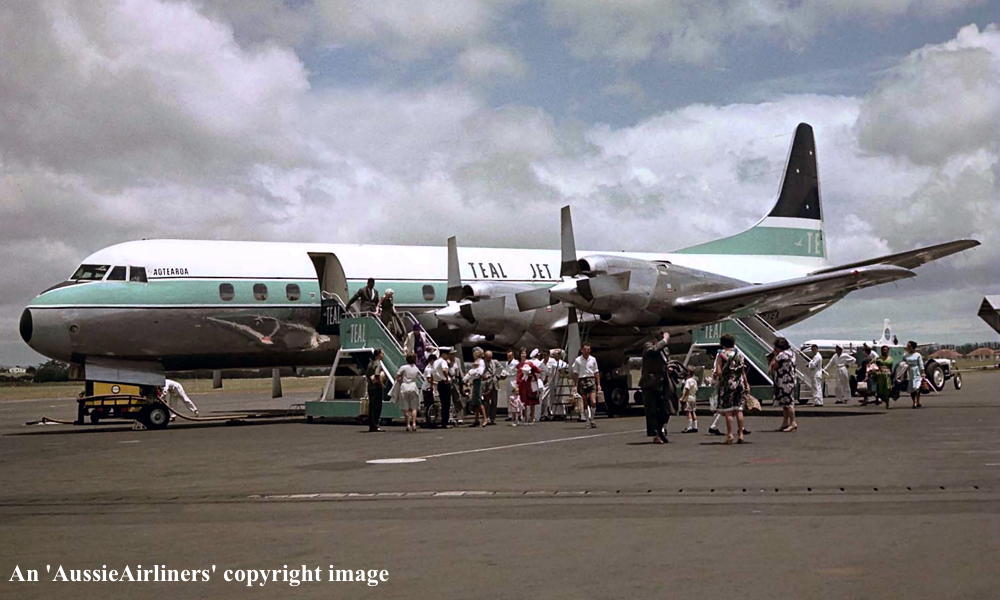 ZK-TEA. TEAL - 'Aotearoa' in the original livery with 'Jet Prop' titles at Auckland Whenuapai Airport, circa 1964. (R. N. Smith Collection Copyright Image 1808-771.) |