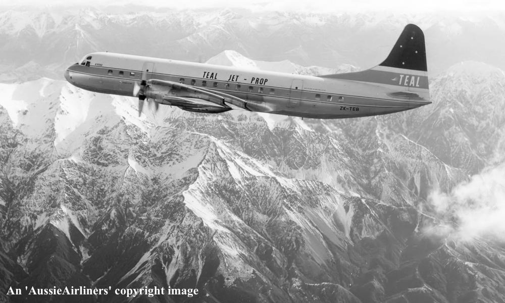ZK-TEB. TEAL Jet-Prop - 'Atarau' in the original livery somewhere over the South Island of New Zealand, December 1959. (P. Sheehan Collection Copyright Image 1808-780.) |