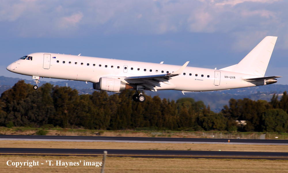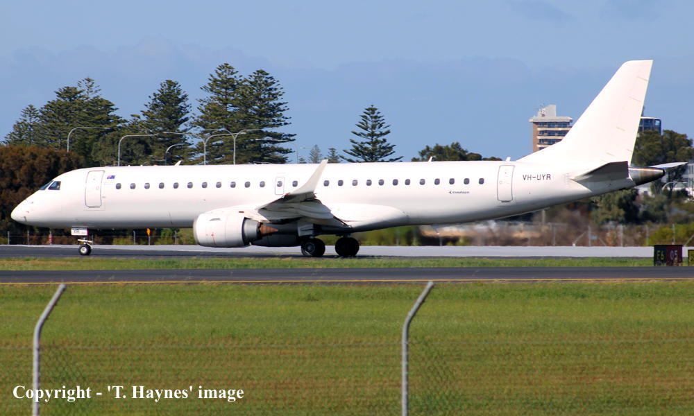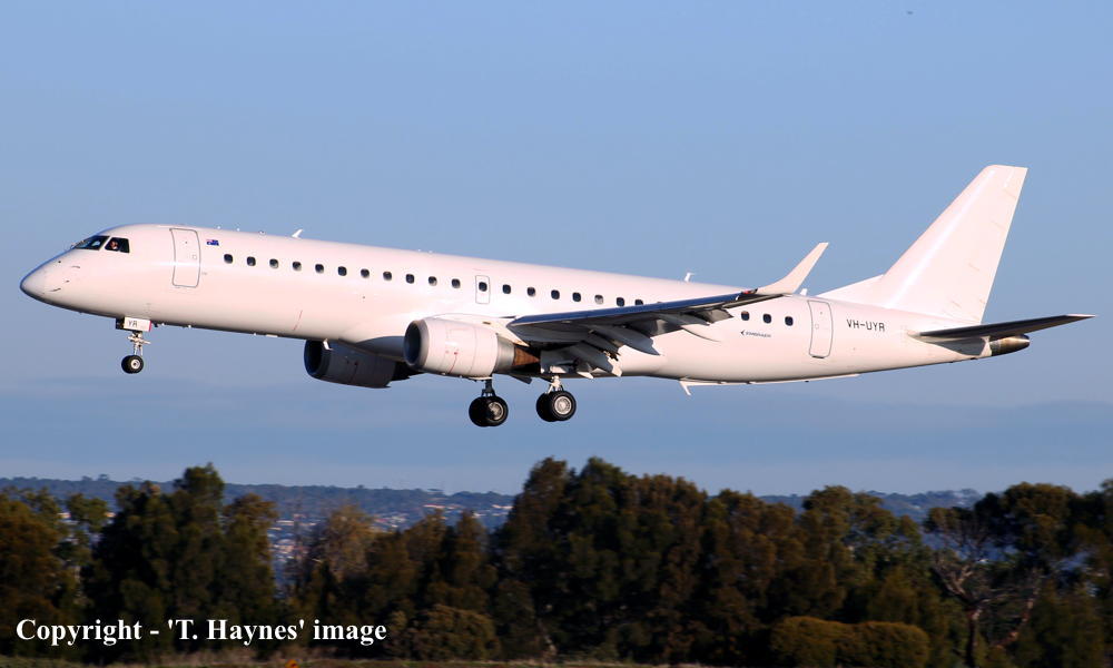 This aircraft was ordered by Copa Airlines, Panama - ? Rolled off the production line at Sao Jose dos Campos, Brazil - August 2007 First flown as 'PT-SNU' - August 2007 Powered by General Electric GE34-10E6 engines Entered onto the Panama Aircraft Register as HP-1564CMP - August 24, 2007 Registered to Copa Airlines, Panama Accepted to Copa Airlines at Sao Jose dos Campos - October 22, 2007 The aircraft was withdrawn from service at San Jose, Costa Rica - March 21, 2020 Cancelled from the Panama Aircraft Register - June 21, 2021 Entered onto the United States Aircraft Register as N901QQ - June 21, 2021 Registered to TPX Aircraft Solutions Inc Trustee, North Salt Lake City, Utah Sold to Alliance Airlines, Australia - ? Departed San Jose on the delivery flight to Australia - October 14, 2021 It arrived at Brisbane (19:26 local) on completion of the delivery flight from Costa Rica - October 16, 2021 Delivery route: San Jose - San Diego - Honolulu - Majuro - Brisbane Cancelled from the United States Aircraft Register - October 18, 2021 Entered onto the Australian Aircraft Register as VH-UYR - October 23, 2021 Registered to Bravo Airlines Pty Ltd, Brisbane Leased to Alliance Airlines Pty Ltd, Brisbane as the registered operator Sub-leased to Capiteq Pty Ltd, Winnellie, Northern Territory as the registered operator - December 03, 2021 Winnellie Pty Ltd t/a Air North Ferried Brisbane - Darwin on delivery to Air North as TT4001 - December 07, 2021 Ferried Darwin - Brisbane on return to Alliance Airlines as TT4000 - April 14, 2022 Sub-leased to Virgin Australia Airlines as the registered operator - April 15, 2022 Operated first Virgin Australia revenue service Brisbane - Townsville as VA367 - April 15, 2022 Current with Alliance Airlines / Virgin Australia |