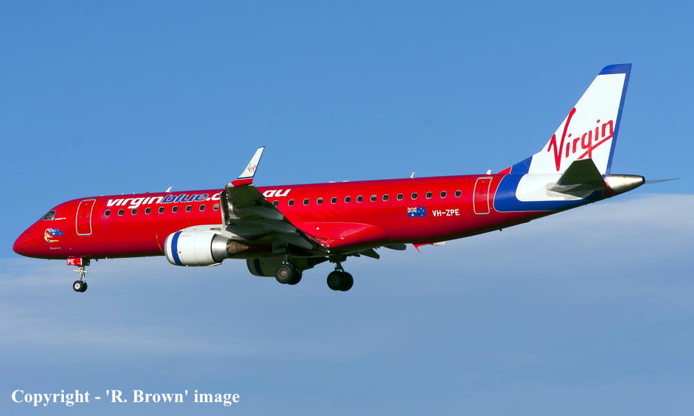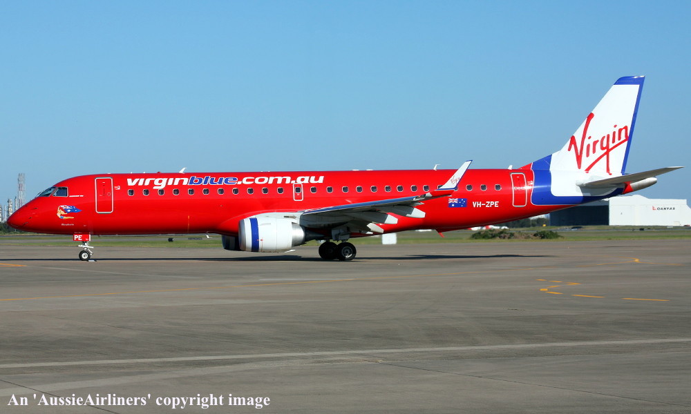 This aircraft was the fifth of eleven new aircraft ordered by Virgin Blue - November 02, 2006 Rolled off the production line at Sao Jose dos Campos, Brazil - June 2008 First flown as PT-SDV - June 2008 Powered by General Electric GE CF34-10E5 engines Entered onto the Australian Aircraft Register as VH-ZPE - June 12, 2008 Registered to VBNC9 Pty Ltd, Spring Hill Leased to Virgin Blue Airlines Pty Ltd as the registered operator Departed Sao Jose dos Campos on the delivery flight to Australia as DJ9082 - June 30, 2008 It arrived at Brisbane on completion of the delivery flight - July 03, 2008 Delivery route: Sao Jose dos Campos - Manaus - Curacao - Brownsville - San Jose - Lihue - Pago Pago - Brisbane The aircraft was named 'Bluephoria' Operated its first revenue service Brisbane - Adelaide (West Beach) as DJ756 - July 09, 2008 Virgin Blue was renamed Virgin Australia Airlines Pty Ltd - May 04, 2011 Current with Virgin Australia Airlines |