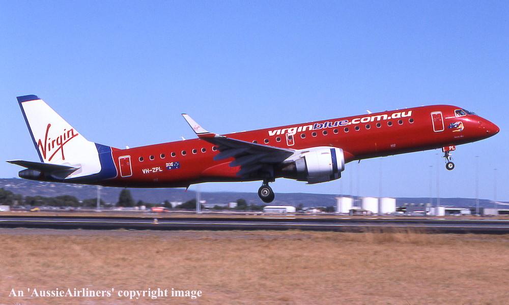 VH-ZPL. Virgin Blue - 'Samba Blue' in the standard livery at Perth Airport, March 17, 2010. (R. Shaw Copyright Image 0190-031.) |