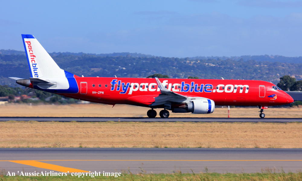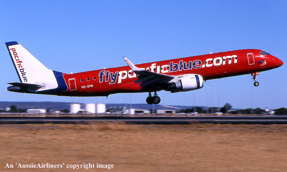 VH-ZPN. Pacific Blue - 'Kanga Blue' in the standard livery at Perth Airport, March 17, 2010. (R. Shaw Copyright Image 0190-032.) |