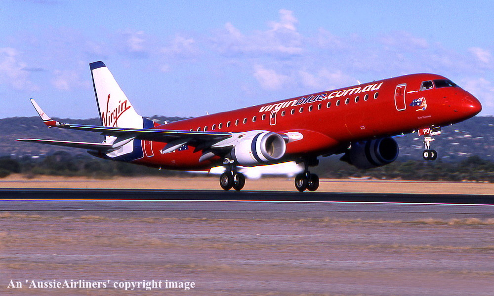 VH-ZPO. Virgin Blue - 'Portia Macquarie' in the standard livery at Perth Airport, March 24, 2010. (R. Shaw Copyright Image 0190-033.) |