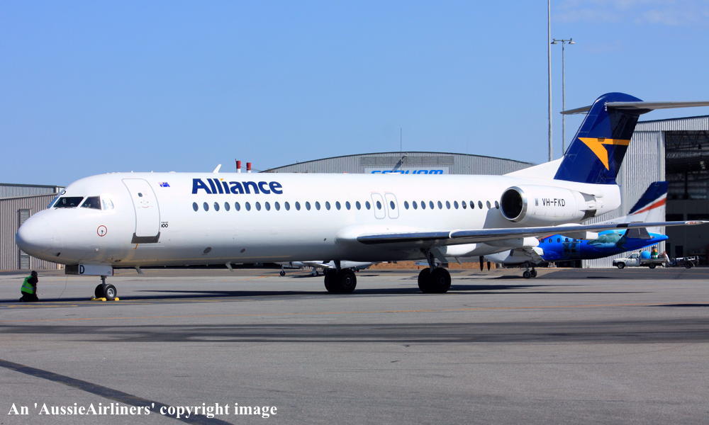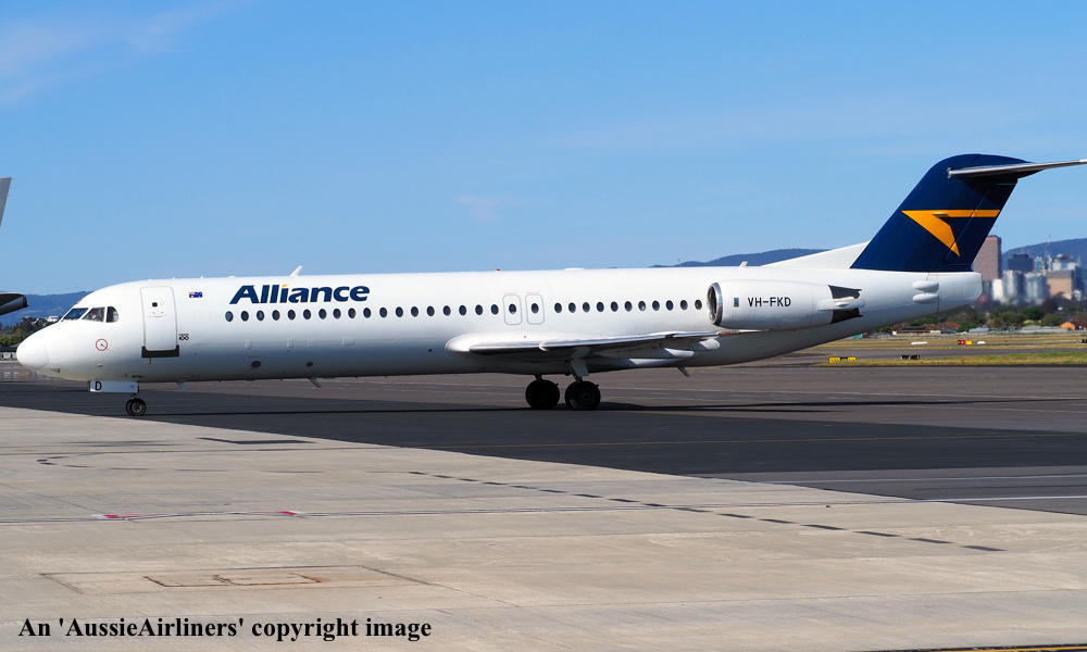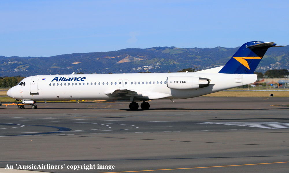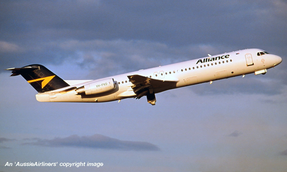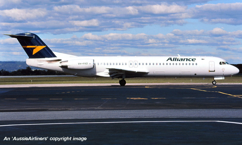 This aircraft ordered new by US Air - ? The temporary export registration 'E-1145 / PH-EZL' was placed on the aircraft - ? First flown as 'PH-EZL' in the US Air livery - September 20, 1991 Powered by Rolls Royce Tay 650-15 engines Entered onto the United States Aircraft Register as N888AU - October 03, 1991 Registered to Fokker Aircraft USA Inc The temporary export registration 'E-1145 / PH-EZL' was removed from the aircraft - October 08, 1991 It was cleared for export to the United States - October 08, 1991 Departed Amsterdam (Schiphol) on the delivery to the United States via Reykjavik - October 10, 1991 Registered to US Air Inc - October 15, 1991 Registered to US Airways when US Air was renamed - February 27, 1997 Operated its final US Airways revenue service Charlotte - Pittsburgh - December 01, 2001 Ferried Pittsburgh - Mojave for storage - December 04, 2001 Sold to The Employees Retirement System of Alabama - 2004 Registered to Wells Fargo Bank Northwest / ERSA - May 23, 2004 Sold to Alliance Airlines, Australia It arrived at Brisbane on completion of the delivery flight as 'Southern Cross 241' - August 09, 2005 Ferry route: Camarillo - Payne Field (Washington) - Anchorage - Nome - Magadan (Russia) - Yuzhno Sakhalinsk (Russia) - Cheju (South Korea) - Manila - Biak - Cairns - Brisbane Entered onto the Australian Aircraft Register as VH-FKD - August 25, 2005 Registered to Aircraft Leasing No 2 Pty Ltd Leased to Alliance Airlines Pty Ltd as the registered operator It was configured with 8 business class and 92 economy class seats Operated its first Alliance revenue service Townsville - Phosphate Hill as QQ835 - December 13, 2006 Current Alliance Airlines |