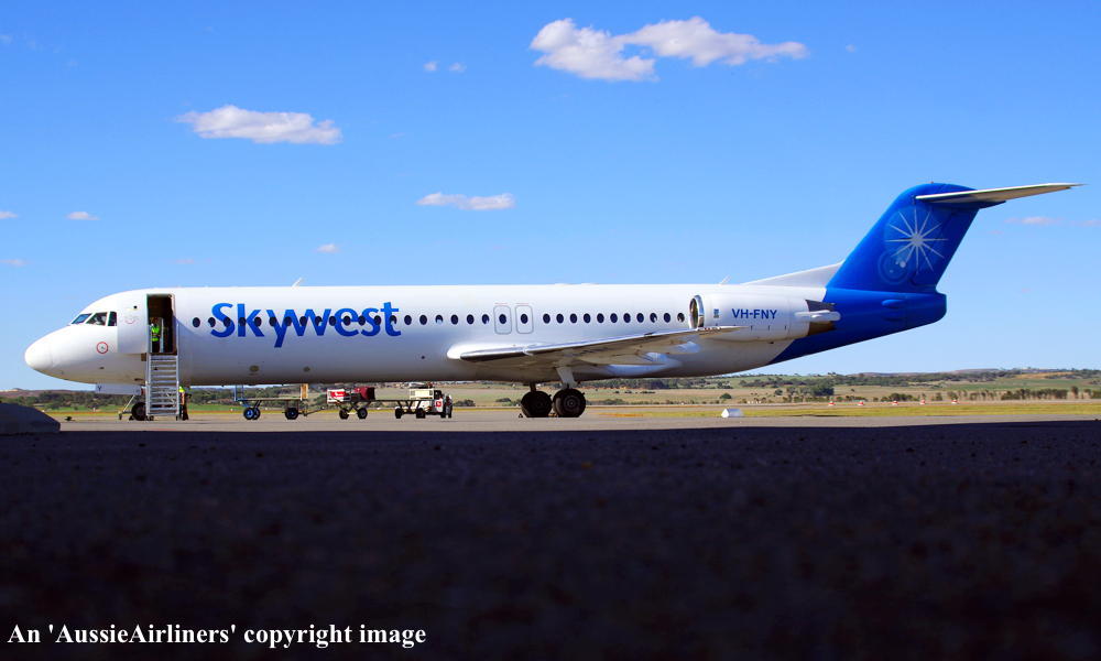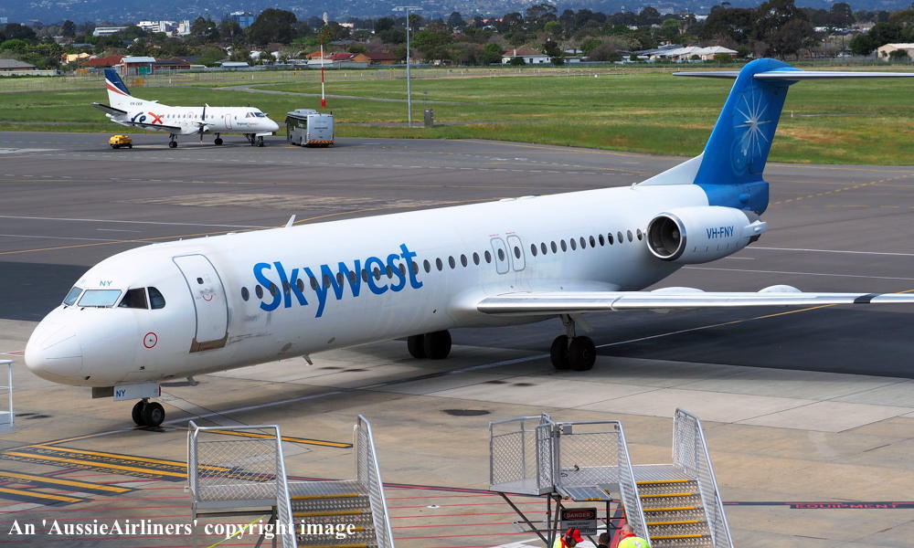 VH-FNY. Skywest - in the standard livery at Adelaide West Beach Airport, August 18, 2018. (T. Haynes Copyright Image 1995-990.) |