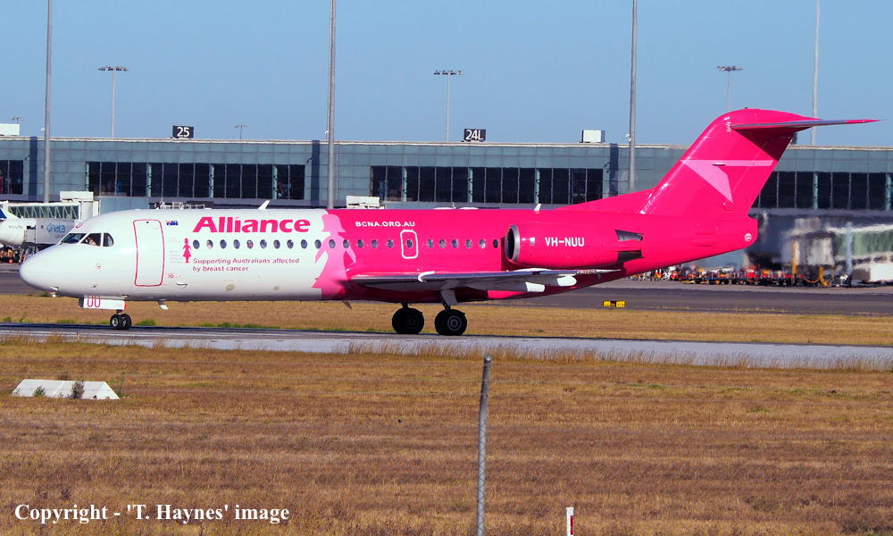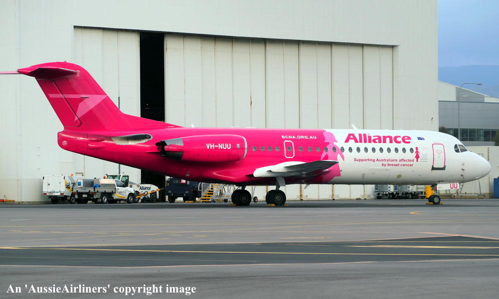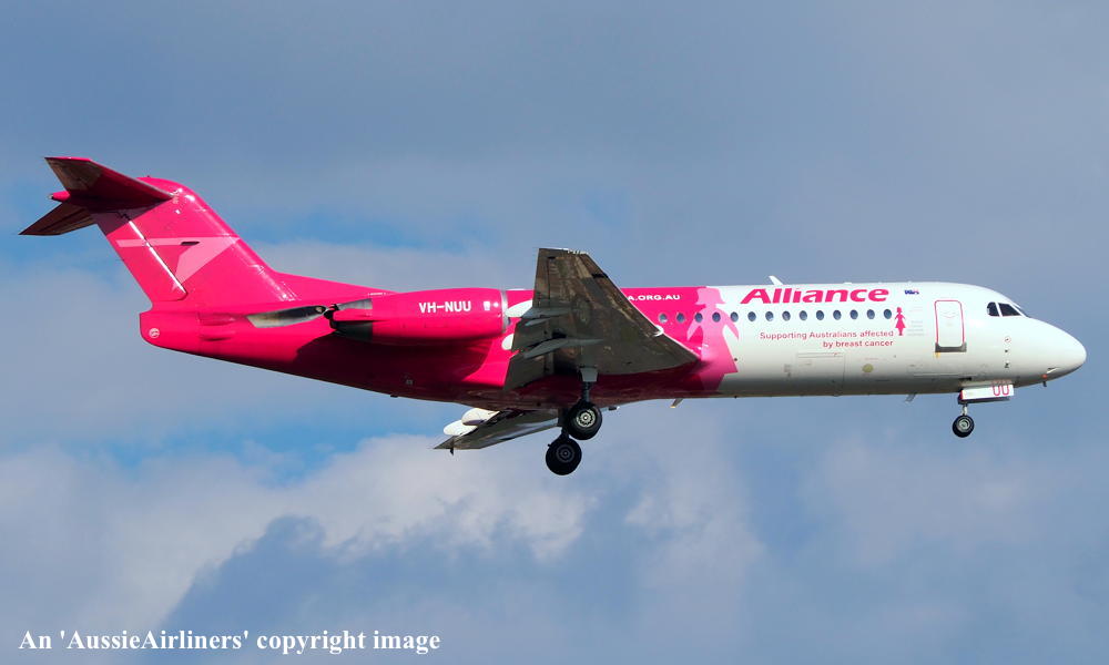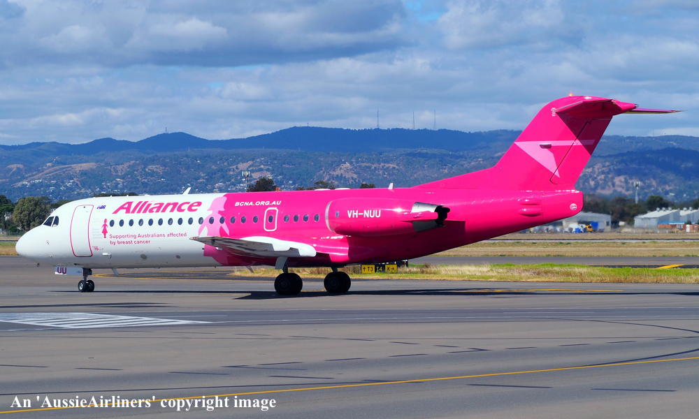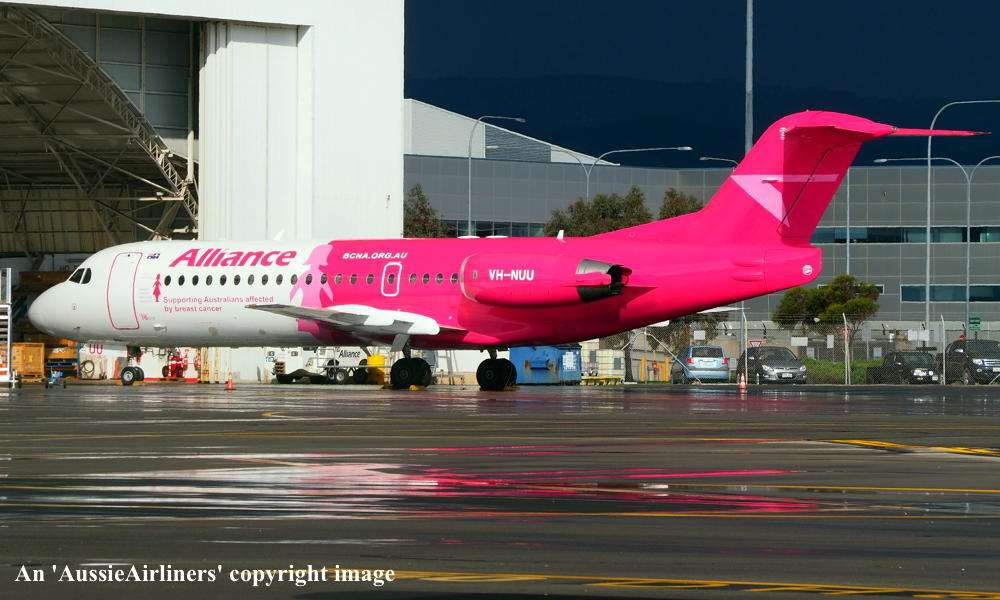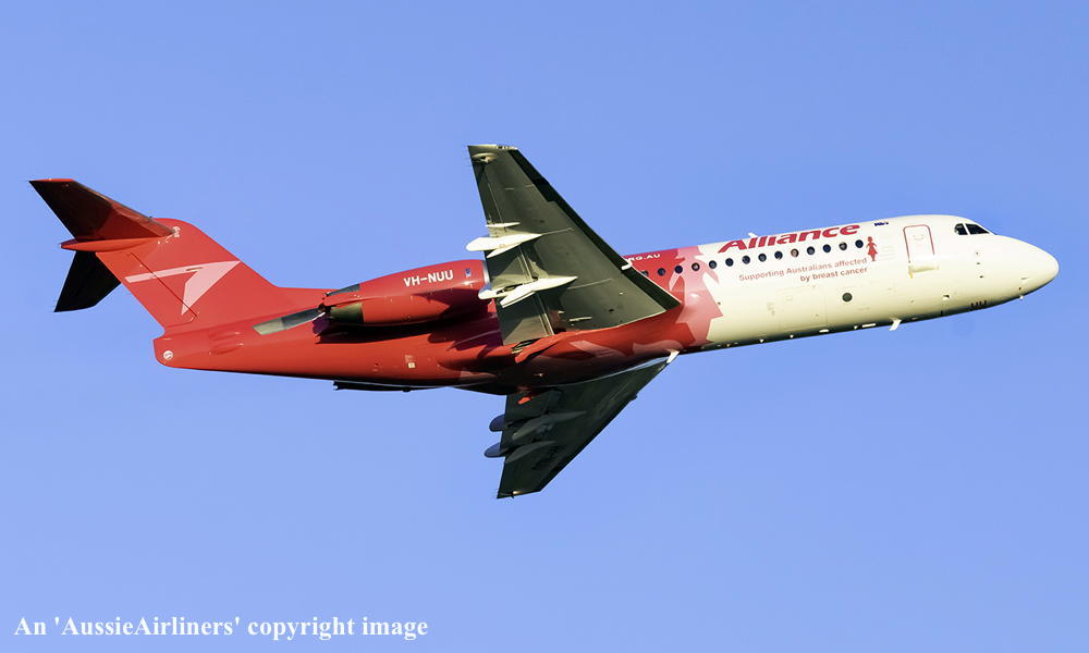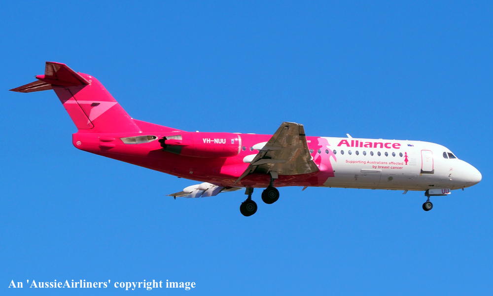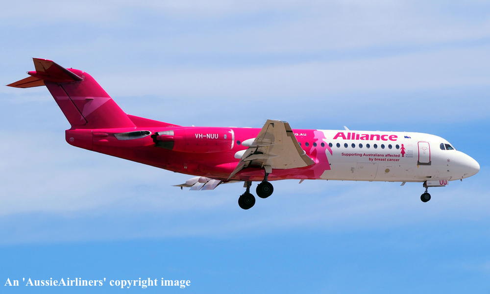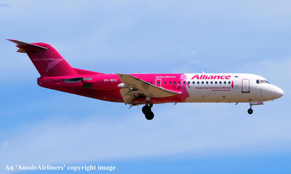 This aircraft was ordered new by Sempati Air Transport - ? The temporary export registration 'E-1389 / PH-EZR' was applied to the aircraft - February 02, 1995 The temporary export registration 'E-1389 / PH-EZR' was reserved by Fokker Aircraft B.V. - February 02, 1995 First flown as 'PH-EZR' in the Sempati Air Transport livery - February 08, 1995 Powered by Rolls Royce Tay 620-15 engines It was cleared for export to Indonesia - March 14, 1995 The temporary export registration 'E-1389 / PH-EZR' was removed from the aircraft - March 17, 1995 Entered onto the Indonesian Aircraft Register as PK-JGJ - March 17, 1995 Registered to East Midlands Aircraft Finance III BV Leased to Sempati Air Transport as the registered operator Accepted by Sempati Air Transport at Amsterdam (Schiphol) - March 17, 1995 Departed Amsterdam (Schiphol) on the ferry flight to Indonesia - March 1995 Operated its first revenue service - March 1995 It was withdrawn from service and stored - ? Cancelled from the Indonesian Aircraft Register - November 1997 Entered onto the Dutch Aircraft Register as PH-WXG - November 06, 1997 Registered to East Midlands Aircraft Finance III BV It arrived at Amsterdam (Schiphol) on completion of the ferry flight from Indonesia - November 09, 1997 Sold / leased to Tyrolean Airways - ? Cancelled from the Dutch Aircraft Register - June 06, 1998 Entered onto the Austrian Aircraft Register as OE-LFJ - June 1998 Registered to Tyrolean Airways It was ferried Woensdrecht - Vienna on delivery to Tyrolean Airways - June 12, 1998 The aircraft was named 'Graz' Tyrolean Airways was acquired by Austrian Airlines - March 1998 In an attempt to consolidate its brand 'Tyrolean Airways' was renamed 'Austrian Arrows' - 2003 Management of 'Austrian Arrows' was carried out independently from the Tyrolean base at Innsbruck The 'Austrian Arrows' livery was chosen to closely match that of the Austrian Airlines Group It was observed at Vienna in the Austrian Arrows livery - October 2003 Flights by the Austrian Airlines Group were carried out by Tyrolean Airways - July 01, 2012 This consolidation was a major effort to save Austrian Airlines from bankruptcy Tyrolean Airways flight operations were reintegrated into Austrian Airlines - October 2014 All aircraft, flight operations and crew members were transferred back to Austrian Airlines - March 31, 2015 Tyrolean Airways was then dissolved having saved Austrian Airlines from bankruptcy Operated its final Austrian Airlines revenue service - ? The aircraft was sold to Alliance Airlines Slovakia - ? The aircraft was ferried Vienna - Bratislava for storage - June 02, 2017 It was observed stored at Bratislava in the 'Austrian Arrows' livery - March 13, 2018 Ferried Bratislava - Norwich for maintenance and repainting as SXI1834 - December 10, 2018 The aircraft acquired a special 'Supporting Australians Affected By Breast Cancer' pink livery Cancelled from the Austrian Aircraft Register - ? Entered onto the Australian Aircraft Register as VH-NUU - January 02, 2019 Registered to Alliance Airlines Pty Limited, Eagle Farm, Brisbane Departed Norwich on the ferry flight to Australia as SXI1834 - August 20, 2019 It arrived at Brisbane on completion of the ferry flight - August 25, 2019 Ferry route: Norwich - Bratislava - Hurghada - Al Ain - Nagpur - Subang - Kupang - Townsville - Brisbane Operated its first revenue service Brisbane - Maroochydore - Emerald as UTY4078 - September 02, 2019 Current with Alliance |
