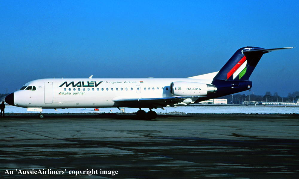 HA-LMA. Malev Hungarian Airlines - in the standard livery with additional 'Alitalia Partner' titles at an unknown airport, February 1996. (R. N. Smith Collection Copyright Image 1995-615.) |