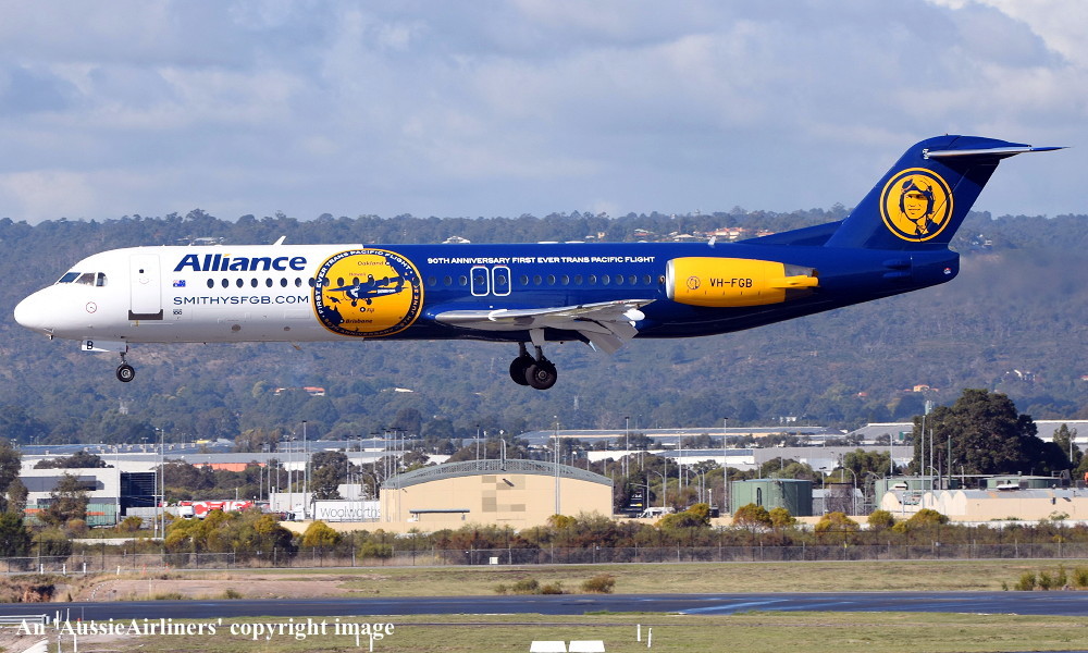 VH-FGB. Alliance - in the special livery with '90th Anniversary First Ever Trans Pacific Flight' titles at Perth Airport, June 12, 2018. (D. Gibbs Copyright Image 1995-921.) |