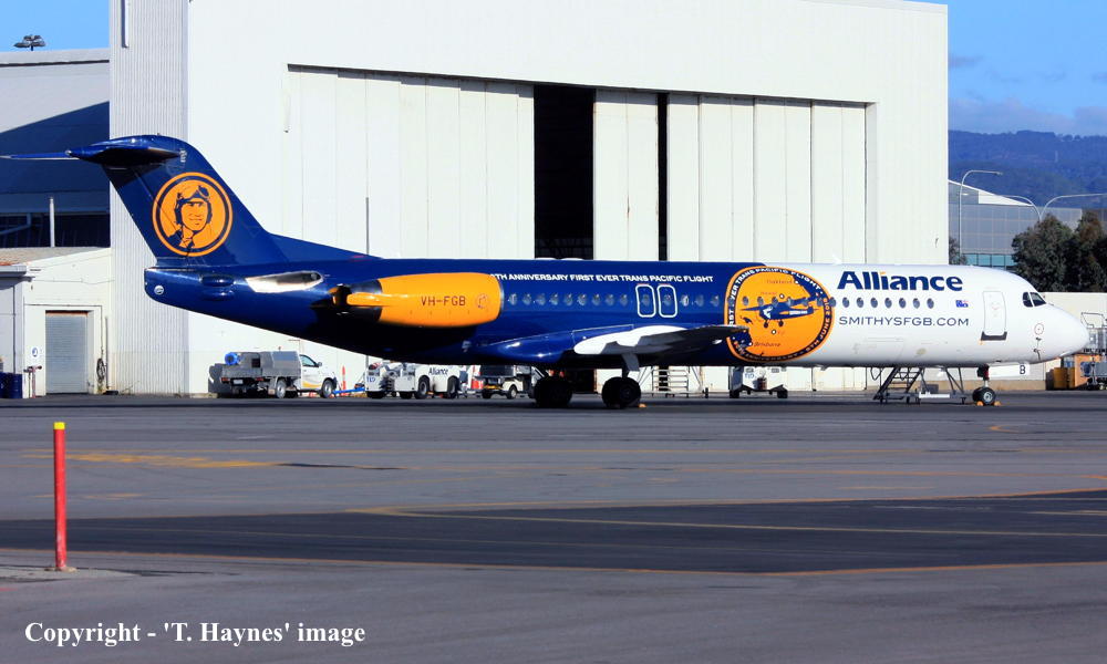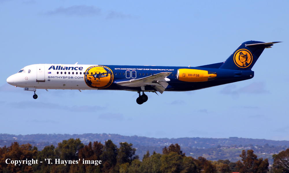 VH-FGB. Alliance - in the special livery with '90th Anniversary First Ever Trans Pacific Flight' titles at Adelaide West Beach Airport, November 27, 2025. (T. Haynes Copyright Image 1996-395.) |
