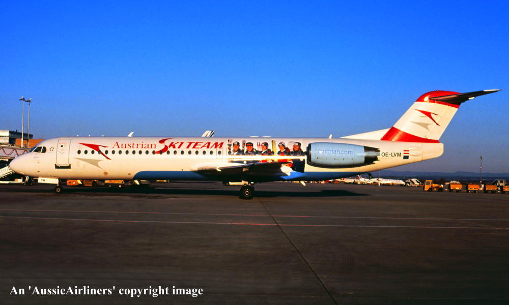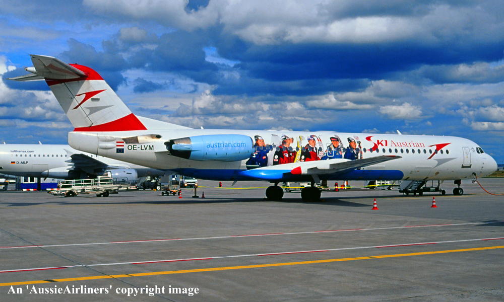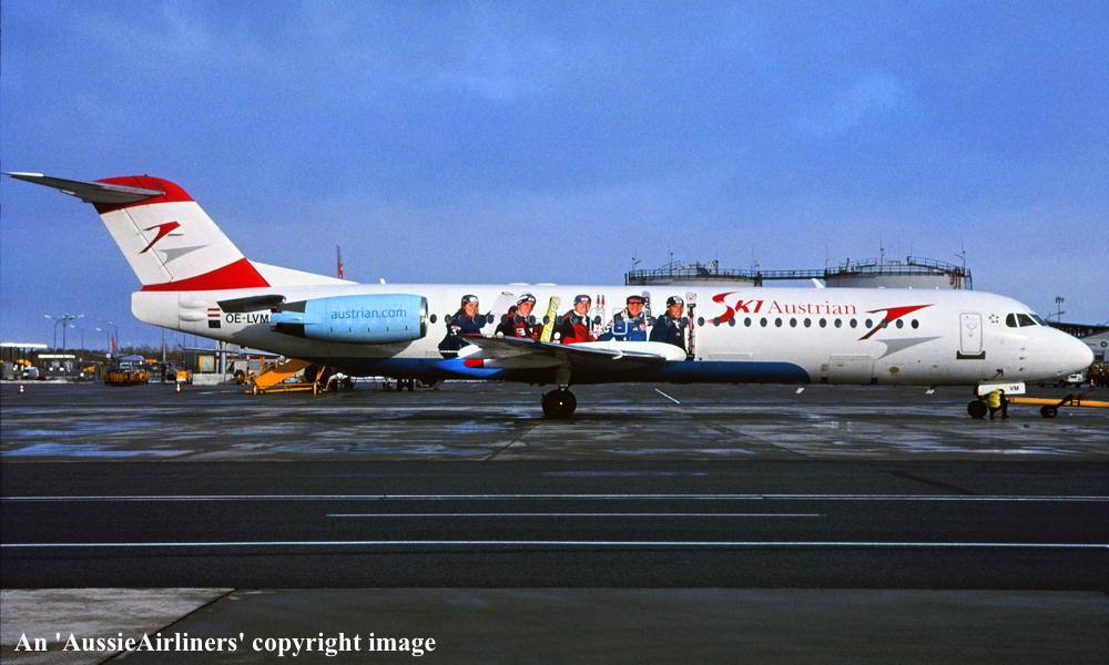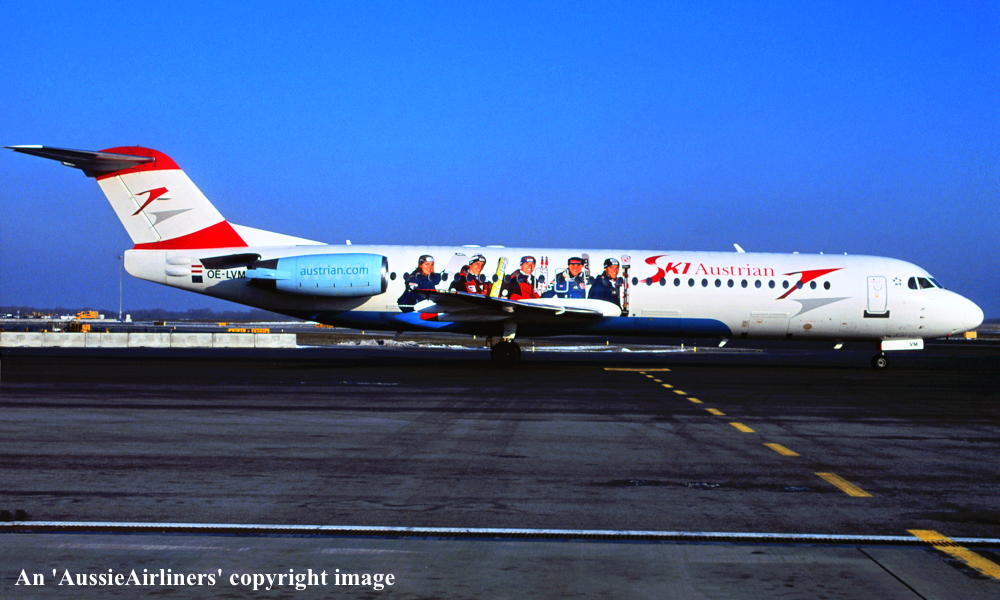 OE-LVM. Austrian - in the standard livery with additional 'Ski' titles and artwork at an unknown airport, December 2010. (R. N. Smith Collection Copyright Image 1996-287.) |