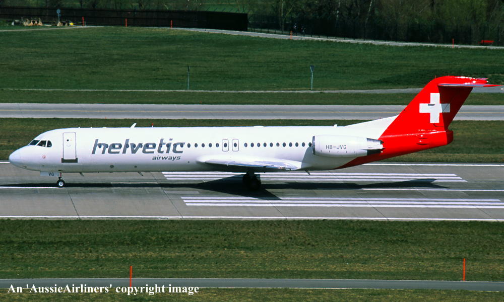HB-JVG. Helvetic Airways - in the standard livery at Zurich Airport, date unknown. (R. N. Smith Collection Copyright Image 1996-110) |