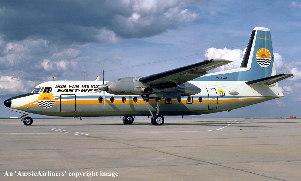 VH-EWG. East-West - 'City of Orange' in the final livery with additional 'Sun Fun Holidays' titles and logo at Melbourne Essendon Airport, August 1972. (R. N. Smith Copyright Image 1999-456.) |