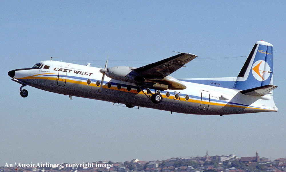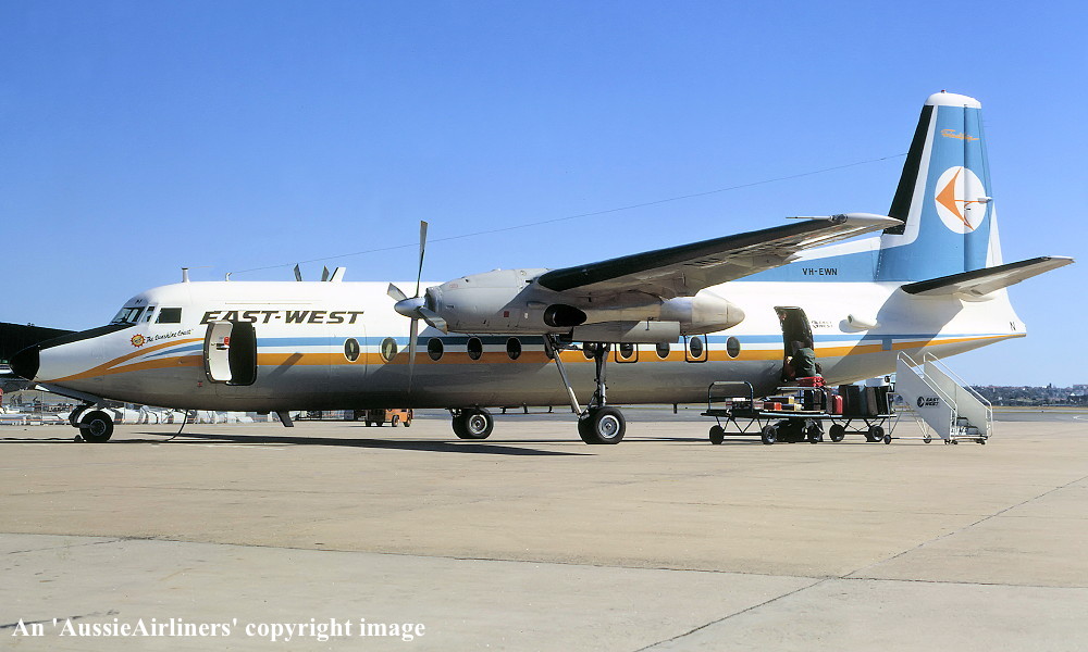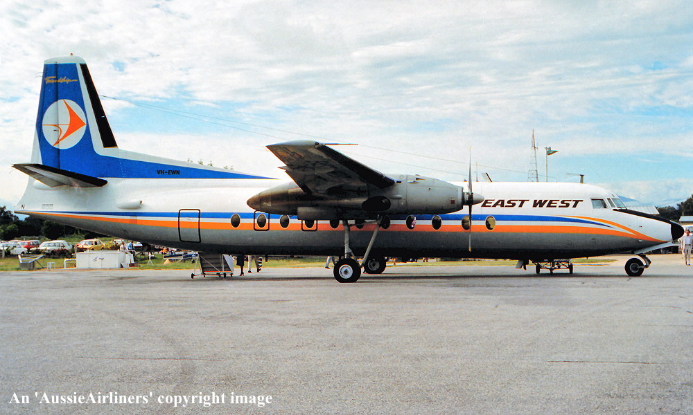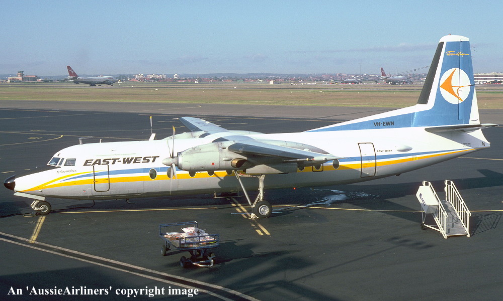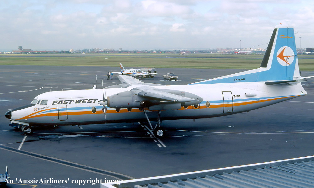 VH-EWN. East-West - 'The Sunshine Coast' in the standard livery at Sydney Kingsford Smith Airport, October 02, 1982. (E. D. Daw Copyright Image 1999-743.) |