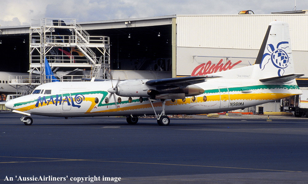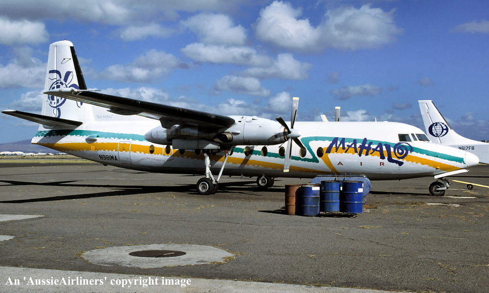 N981MA. Mahalo Air - 'The Honu' in the standard livery at Honolulu Airport, March 1994. (R. N. Smith Collection Copyright Image 1999-029.) |