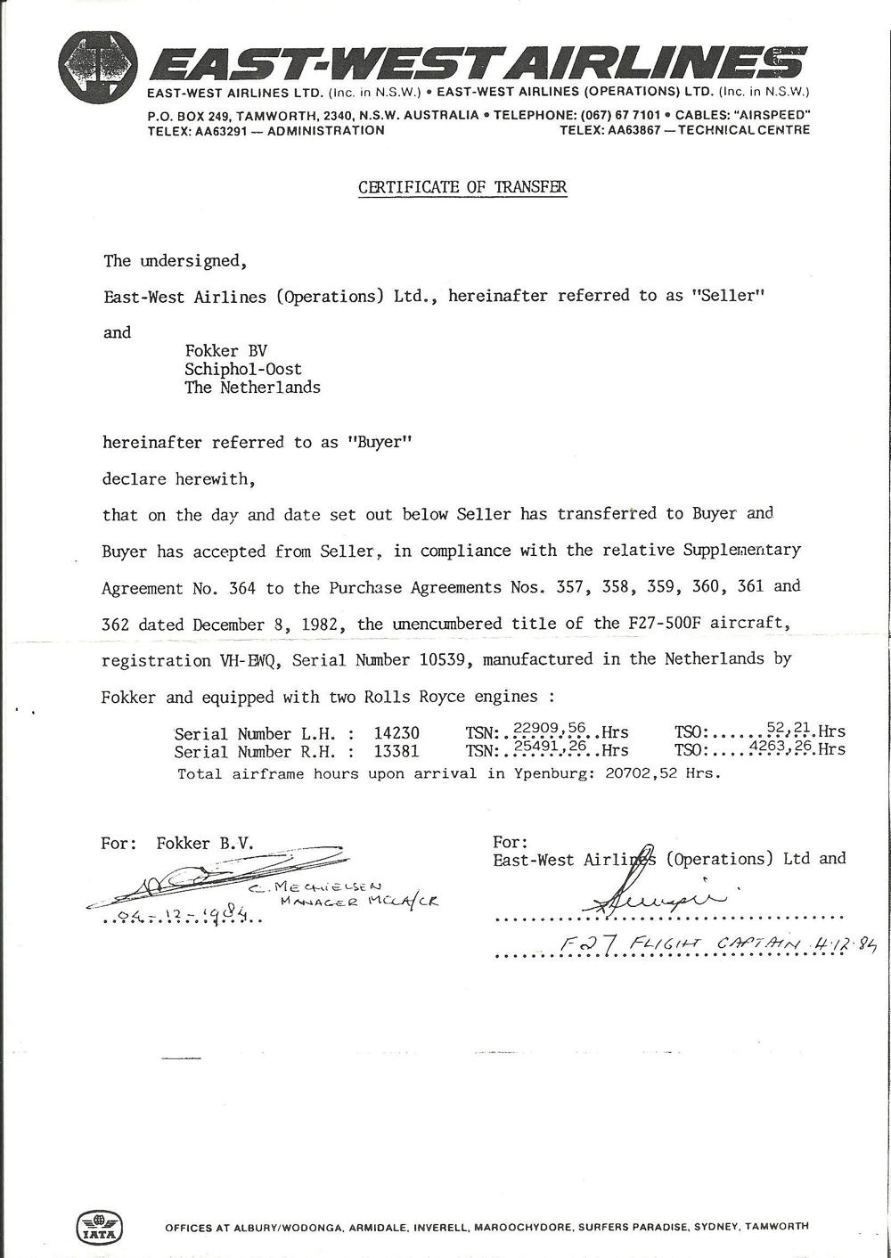 VH-EWQ. East-West - copy of the transfer document, December 04, 1984. (C. Mechielsen Copyright Image 1993-618.) |