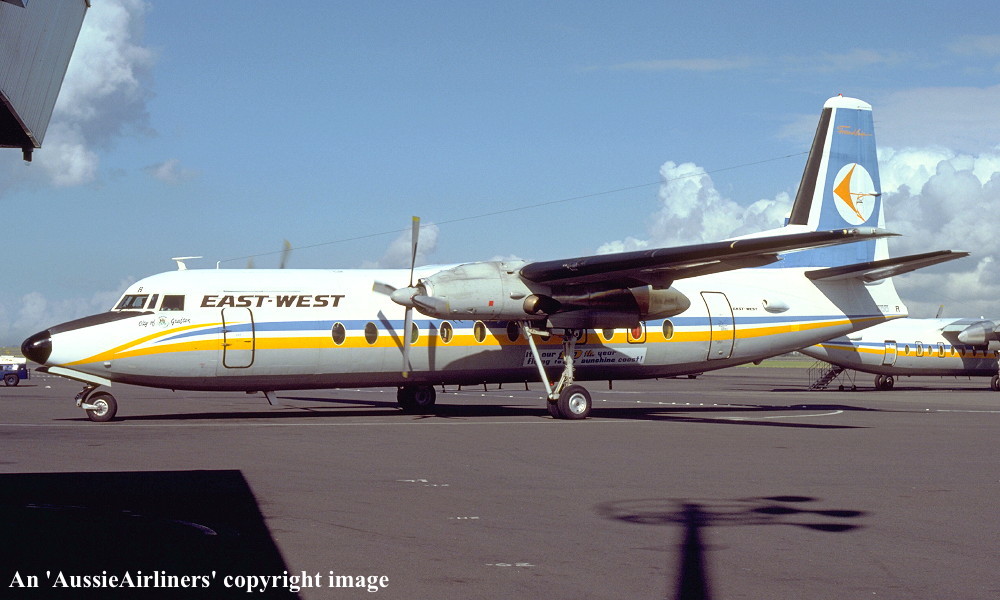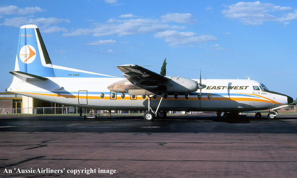 VH-EWR. East-West - 'City of Grafton' in the standard livery at Sydney Kingsford Smith Airport, May 1982. (R. N. Smith Copyright Image 1999-684.) |