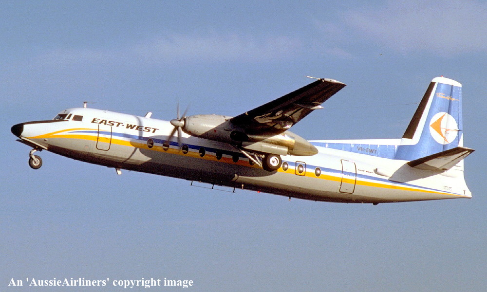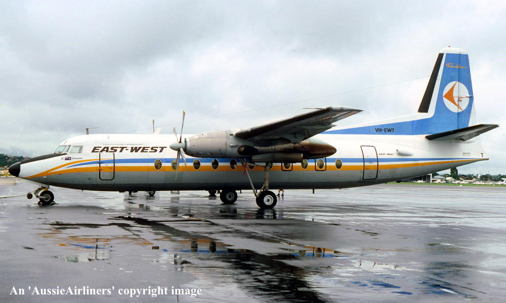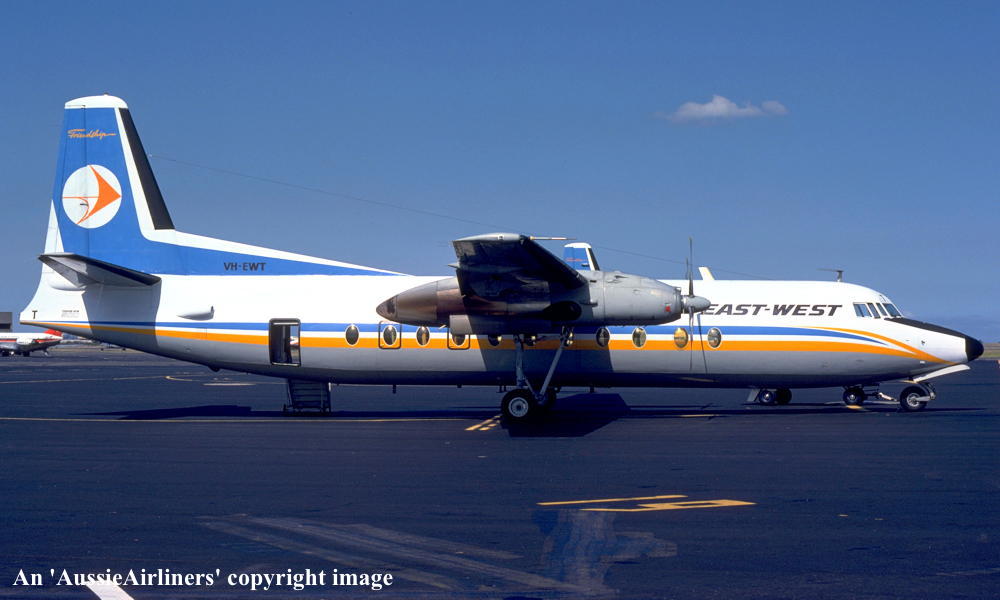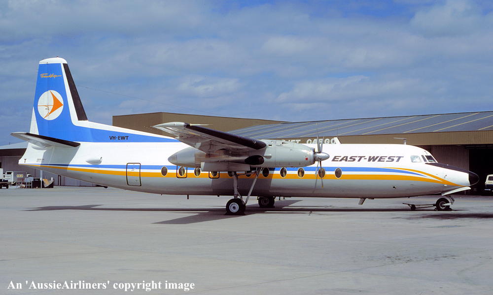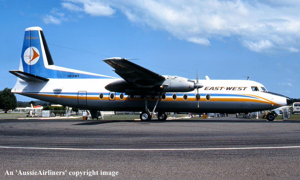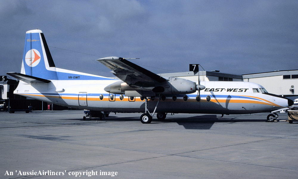 VH-EWT. East-West - in the standard livery at Melbourne Tullamarine Airport, date unknown. (R. N. Smith Collection Copyright Image 1999-095.) |