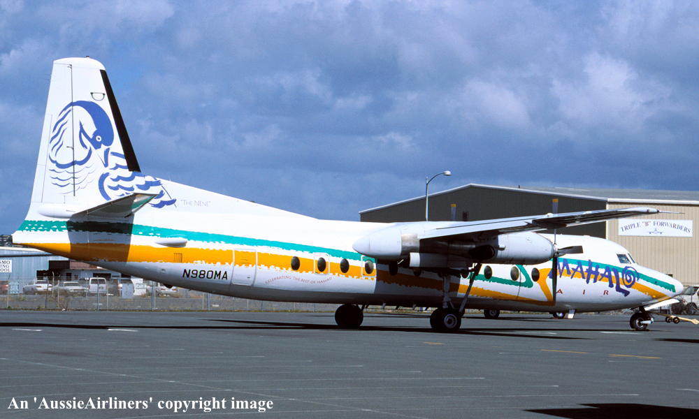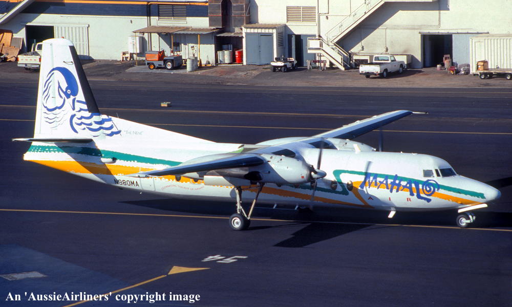 N980MA. Mahalo Air - in the standard livery at Honolulu Airport, December 1993. (R. N. Smith Collection Copyright Image 1999-854.) |