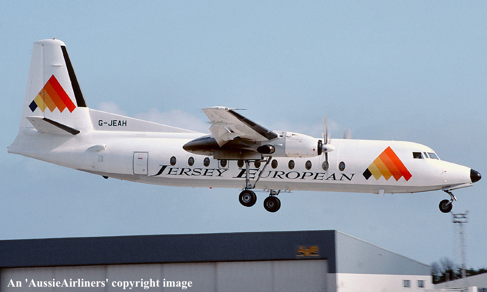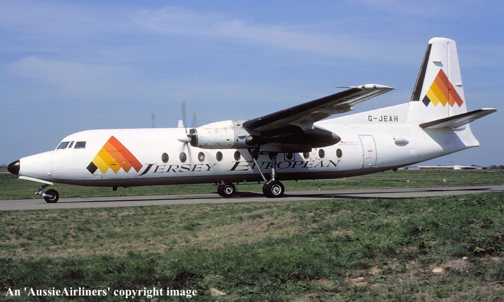 G-JEAH. Jersey European - in the standard livery at Jersey Airport, August 21, 1995. (R. N. Smith Collection Copyright Image 1999-155.) |