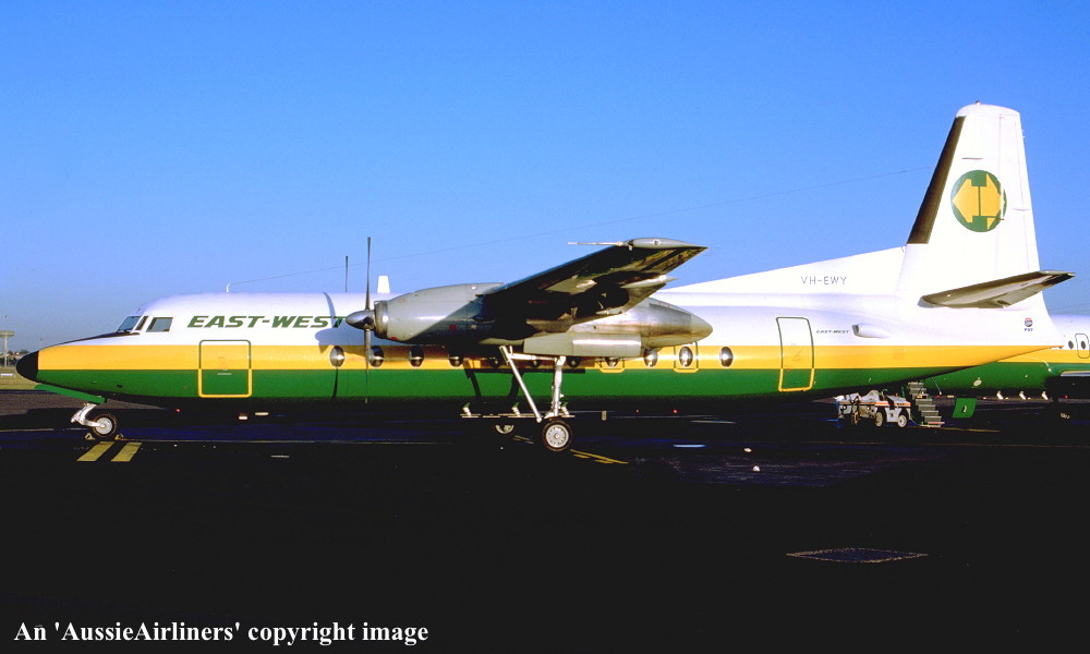 VH-EWY. East-West - 'City of Armidale' in the final livery at Sydney Kingsford Smith Airport, January 1985. (R. N. Smith Copyright Image 1999-710.) |