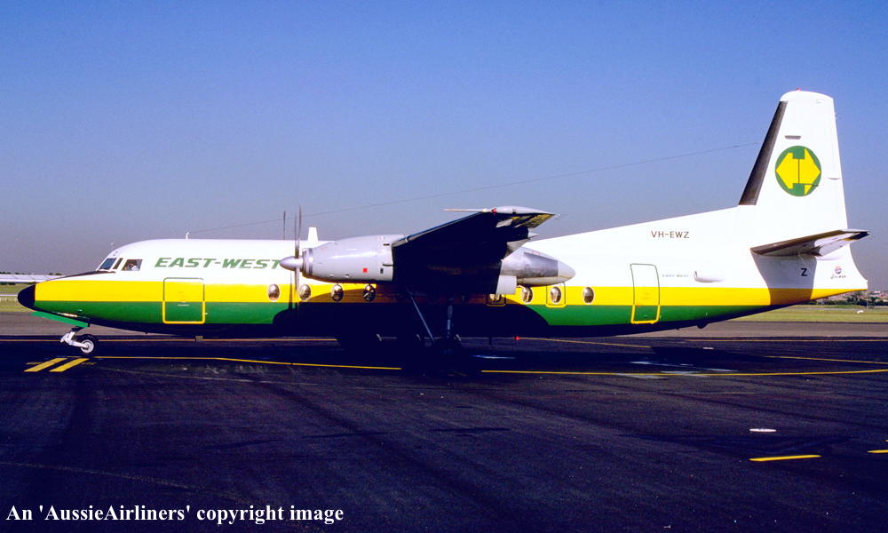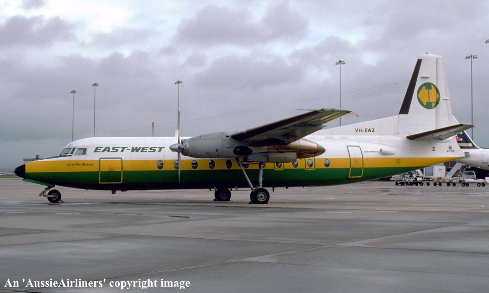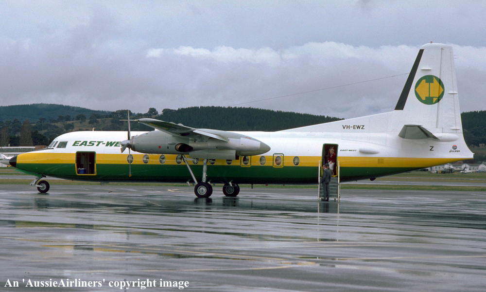 VH-EWZ. East-West - 'City of Port Macquarie' in the final livery at Melbourne Tullamarine Airport, June 1989. (R. N. Smith Collection Copyright Image 1999-726.) |