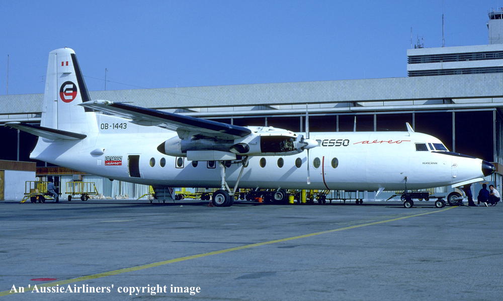 OB-1443. Expresso Aero - 'Huascaran' in the standard livery at an unknown airport, April 1992. (R. N. Smith Collection Copyright Image 1999-449.) |