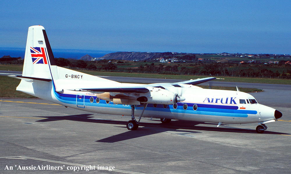 G-BNCY. Air UK - in the old livery at Guernsey Airport, August 1988. (R. N. Smith Collection Copyright Image 1999-550.) |