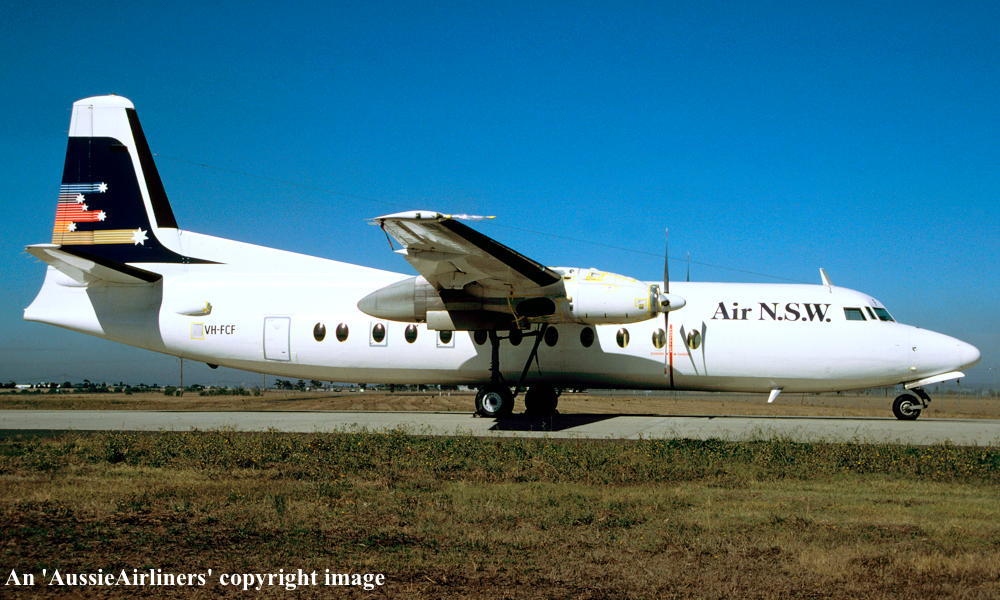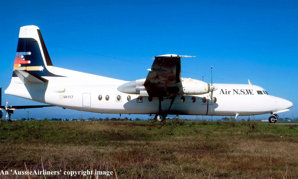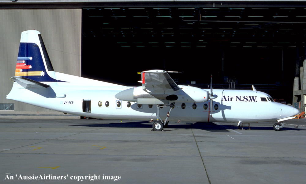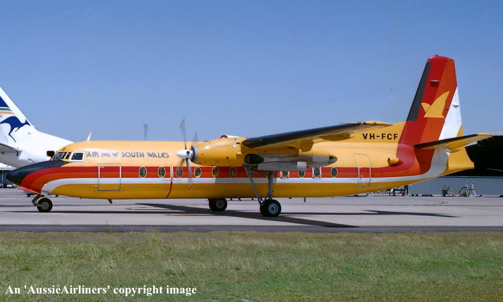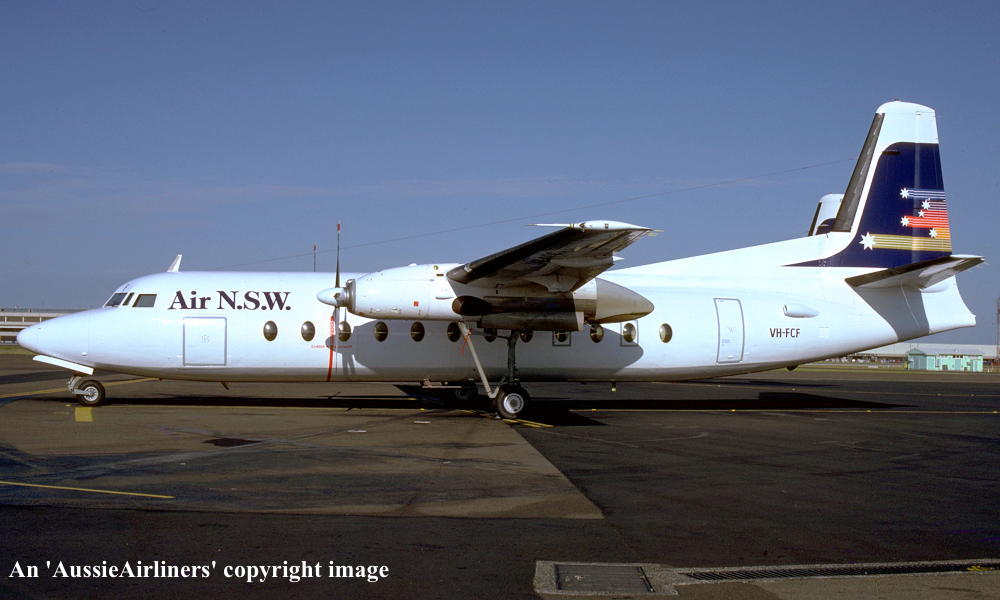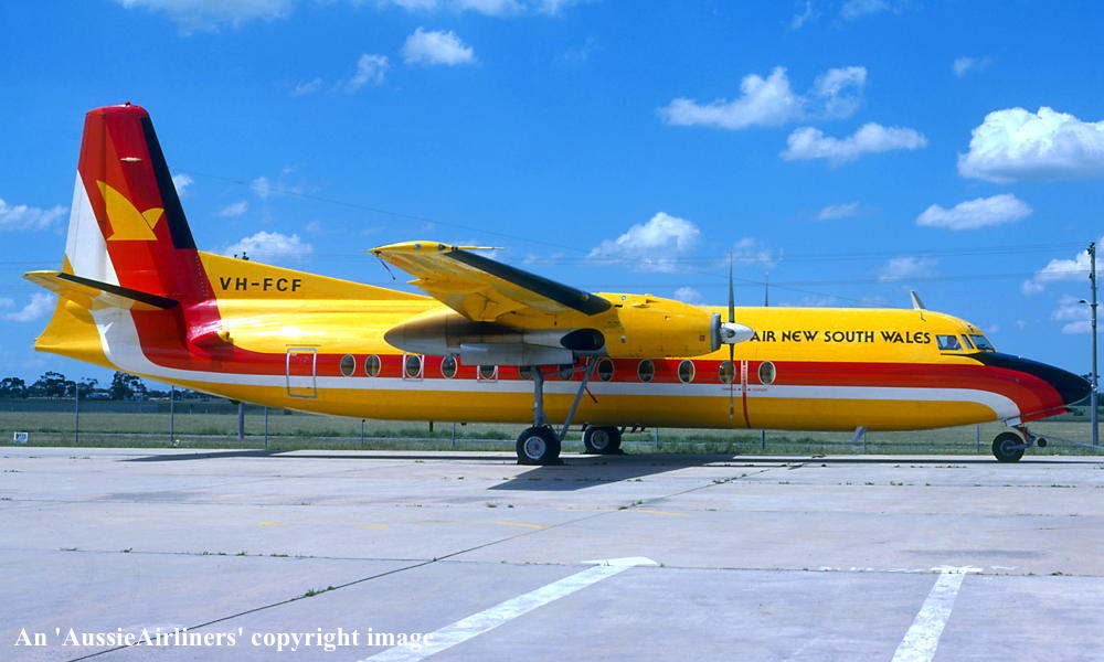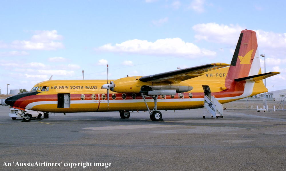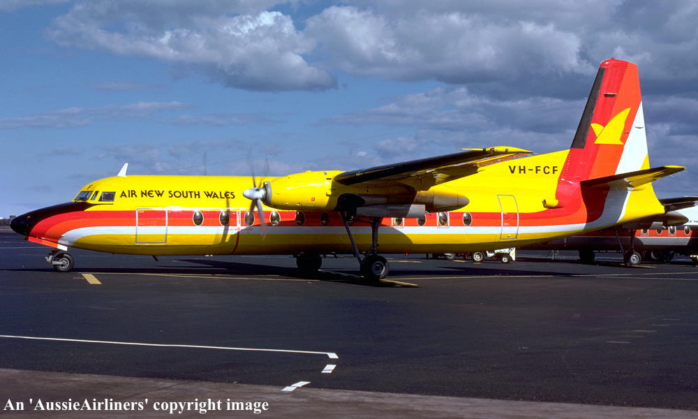 VH-FCF. Air N.S.W. - in the 'Southern Cross' livery at Sydney Kingsford Smith Airport, January 07, 1987. (R. N. Smith Copyright Image 1999-556.) |