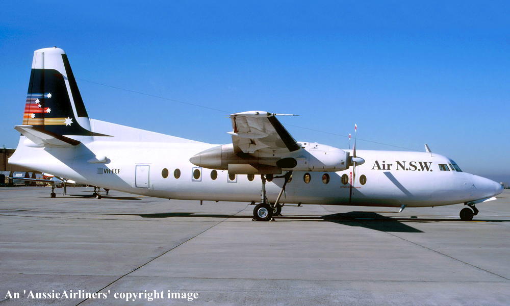 VH-FCF. Air N.S.W. - in the 'Southern Cross' livery at Melbourne Tullamarine Airport, August 1988. (G. Bennett Copyright Image 1999-922.) |