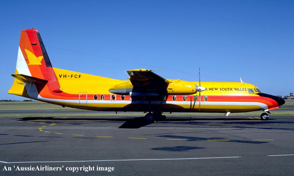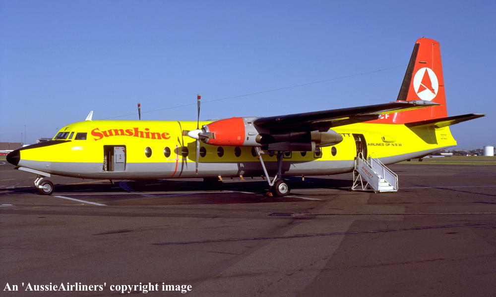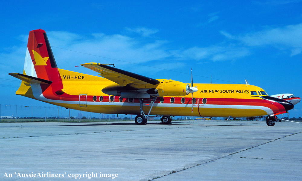 VH-FCF. Air New South Wales - in the 'canary' livery at Sydney Kingsford Smith Airport, September 19, 1981. (R. N. Smith Copyright Image 1999-555.) |