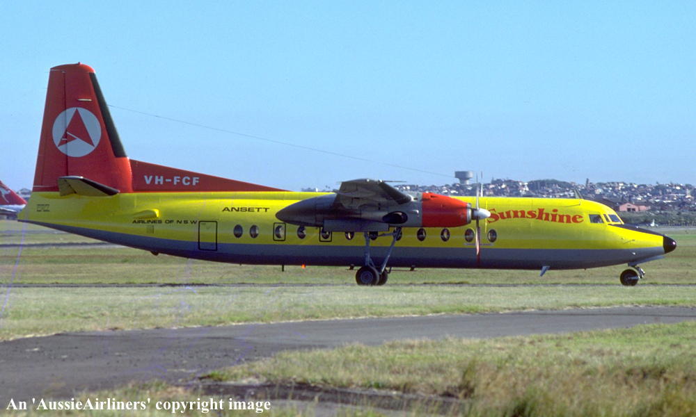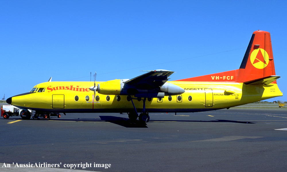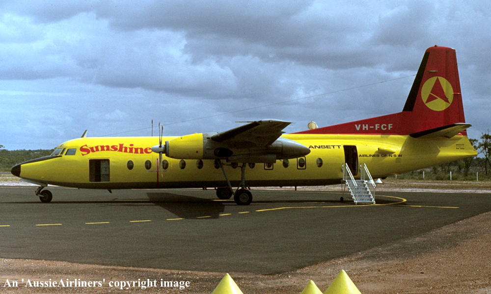 VH-FCF. Ansett Airlines of N.S.W. - in the revised 'Sunshine' livery at Hervey Bay Airport, May 1980. (G. Wilkes Copyright Image 1999-361.) |