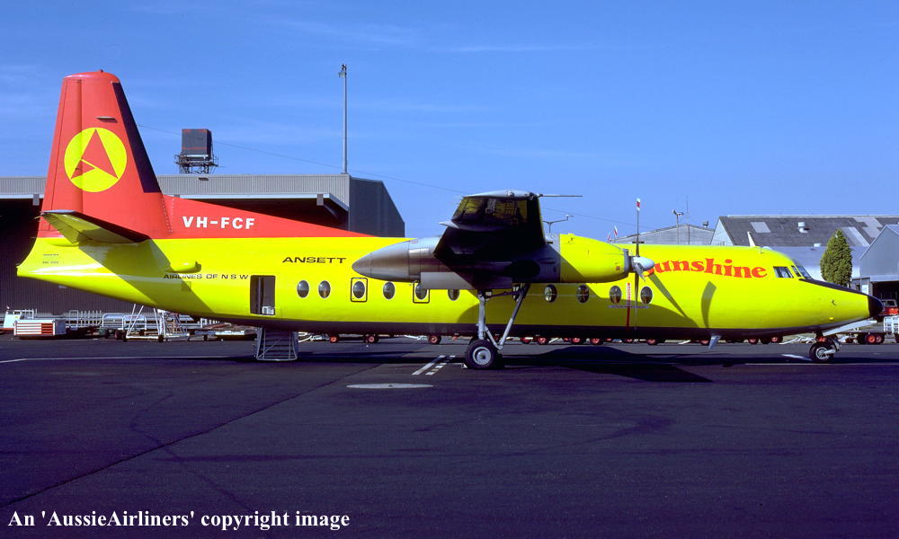 VH-FCF. Air New South Wales - in the 'canary' livery at Melbourne Tullamarine Airport, date unknown. (R. N. Smith Collection Copyright Image 1999-044.) |