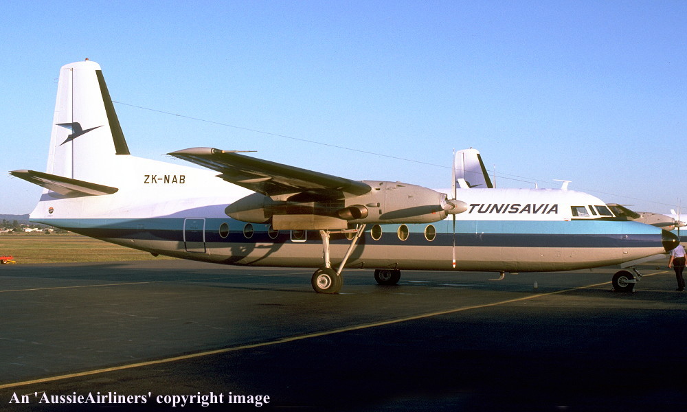 ZK-NAB. Tunisavia - in the standard livery at Christchurch Airport, September 1983. (J. Mounce Copyright Image 1991-045.) |