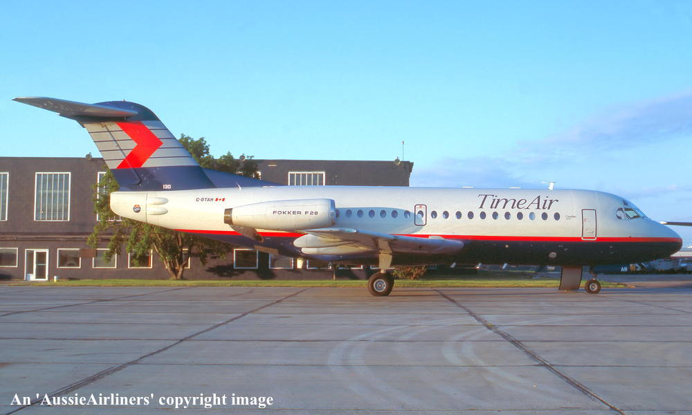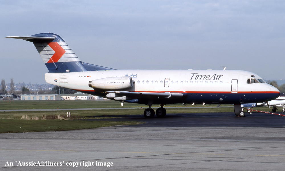 Entered onto the Dutch Aircraft Register as PH-EXN - July 17, 1974 Registered to NV Kon. Ned. Vliegtuigenfabriek Fokker First flown as PH-EXN - August 07, 1974 Powered by Rolls Royce RB183-2 Spey Mk555-15 engines The aircraft was placed in storage at Woensdrecht Export Registration 'E-412 / PH-EXN' applied for - December 02, 1976 Sold to the Department of Civil Aviation, Australia - December 1976 Entered onto the Australian Aircraft Register as VH-ATE - December 09, 1976 Registered to Department of Transport, Air Transport Group Accepted by the Department of Civil Aviation at Amsterdam (Schiphol) - December 13, 1976 This aircraft was purchased for the calibration and testing of navigational aids around Australia Withdrawn from use and stored at Melbourne (Essendon) - ? Sold to Ansett Transport Industries - November 29, 1987 Registered to Ansett Transport Industries (Operations) Pty Ltd - December 21, 1987 Reportedly purchased for operations by Air N.S.W. The aircraft was not suitable for converting to passenger configuration for R.P.T. use by Air N.S.W. Prepared for resale at the Ansett Melbourne (Tullamarine) Maintenance Base Sold to Time Air Ltd, Canada - March 1988 Cancelled from the Australian Aircraft Register - March 10, 1998 Entered onto the Canadian Aircraft Register as C-GTAH - March 14, 1988 Departed Melbourne (Tullamarine) on the delivery flight to Canada - March 15, 1988 It arrived at Saskatoon on completion of the delivery flight - Mrch 19, 1988 Delivery route: Melbourne - Cairns - Port Moresby - Guam - Wake Island - Midway Island - Aduk - Saskatoon Flight crew: Time Air Captain ?, Captain E. Montagu (Ansett WA); Time Air Engineer; Time Air G.M. Transferred to Canadian Regional Airlines when Time Air and Ontario Express merged - March 01, 1993 The aircraft was named 'Spirit of Minneapolis' Canadian Regional Airlines merged with Air Canada Regional - January 01, 2001 Registered to Air Canada Regional Inc, Enfield, Nova Scotia - November 22, 2001 Leased to Air NorTerra Inc t/a Canadian North - March 01, 2002 Air Canada Regional was renamed Jazz Air Registered to Air Canada Jazz - July 12, 2002 Operated its final revenue service Saskatchewan - Calgary - August 24, 2002 Ferried Calgary - Saskatoon for storage - August 27, 2002 Officially withdrawn from service and stored at Saskatchewan It had flown 39,145 hours with 43,662 cycles Registered to Quest Aviation Holdings Ltd Partnership by General Partner 3814742 Canada Ltd - July 20, 2006 It was observed stored intact at Saskatchewan - August 02, 2006 Stored intact at Saskatchewan - April 19, 2009 Current status - ? |