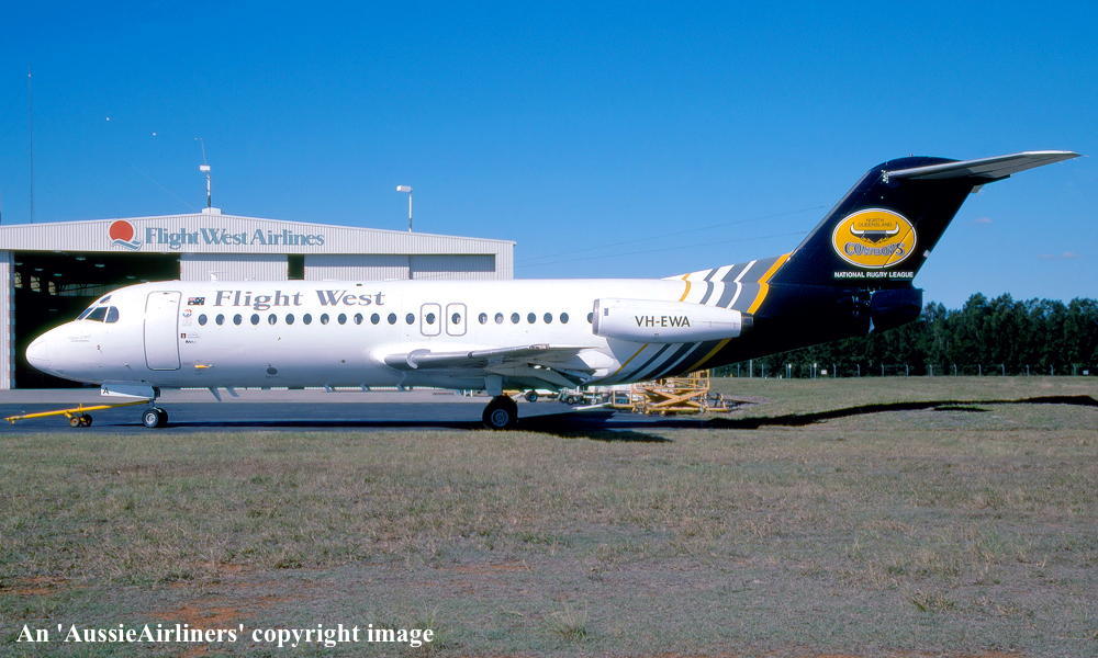 VH-EWA. Flight West - in the 'North Queensland Cowboys' livery at Brisbane Airport, June 2000. (R. N. Smith Collection Copyright Image 1995-223.) |