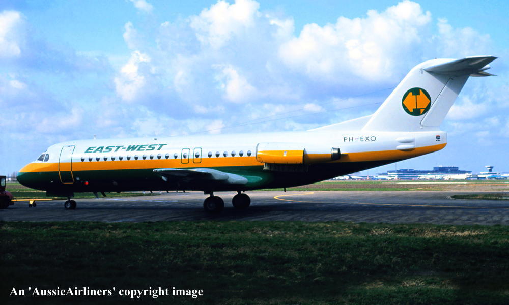 PH-EXO. East-West - in the standard livery at Amsterdam Schiphol Airport, April 1983. (R. N. Smith Collection Copyright Image 1995-504.) |