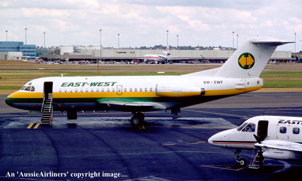 VH-EWF. East-West - in a modified livery at Sydney Kingsford Smith Airport, January 03, 1988. (R. N. Smith Copyright Image 1995-234.) |