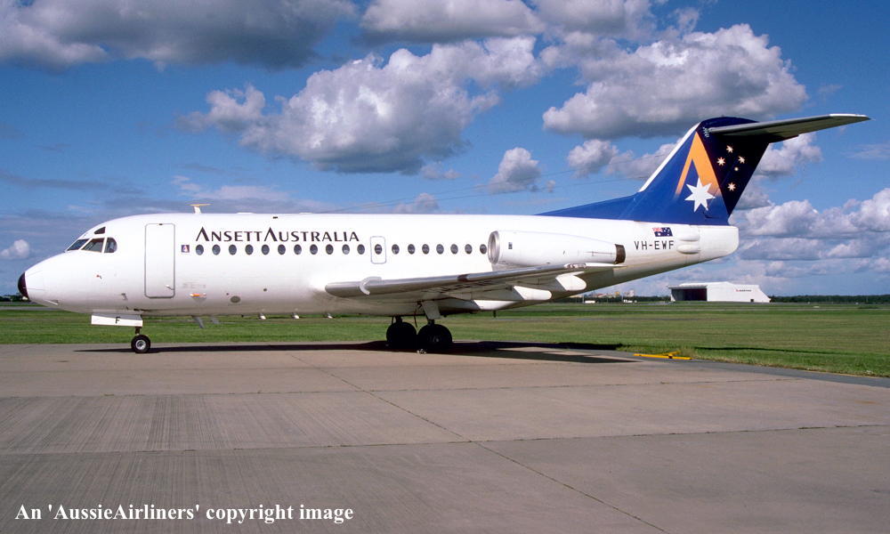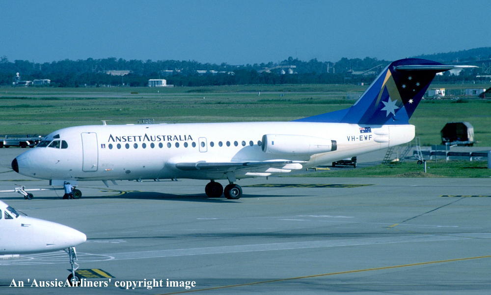 VH-EWF. Ansett Australia - in the 'Starmark' livery at Brisbane Airport, date unknown. (R. N. Smith Collection Copyright Image 1995-032.) |