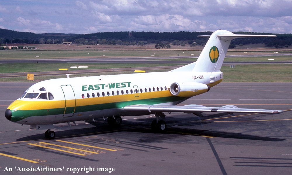VH-EWF. East-West - in a modified livery at Canberra Airport, February 1990. (E. D. Daw Copyright Image 1995-050.) |