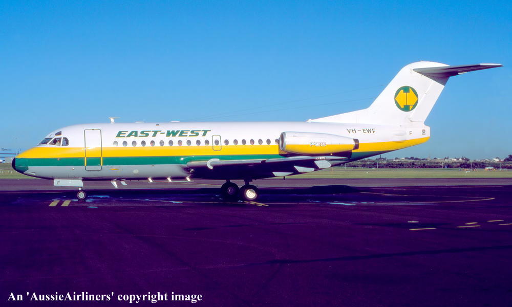 VH-EWF. East-West - in a modified livery at Sydney Kingsford Smith Airport, December 1988. (R. N. Smith Collection Copyright Image 1995-003.) |
