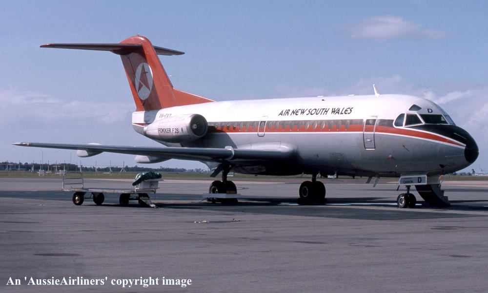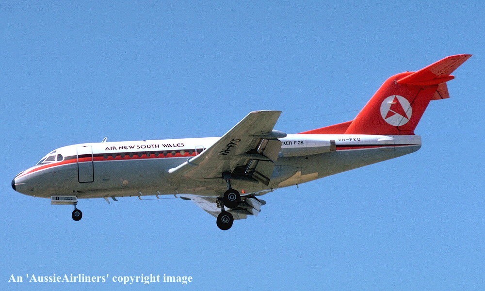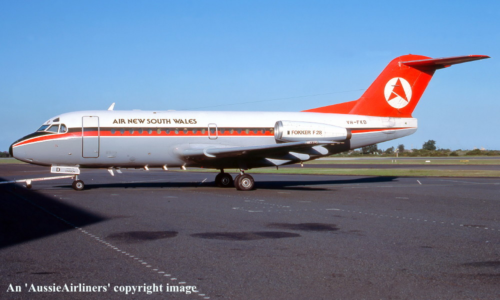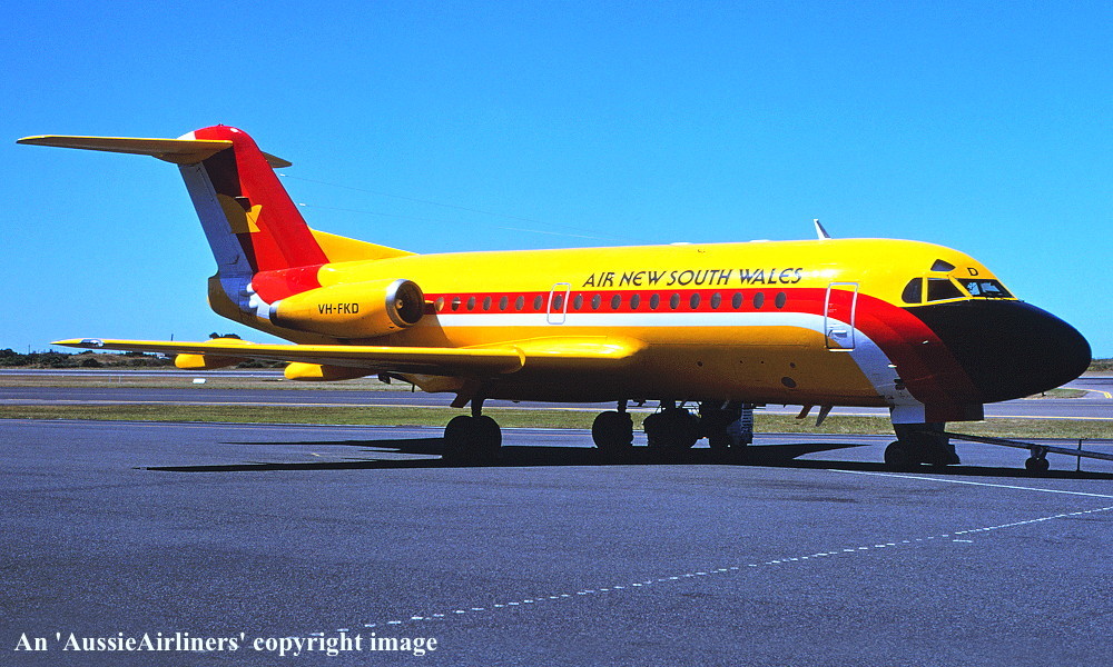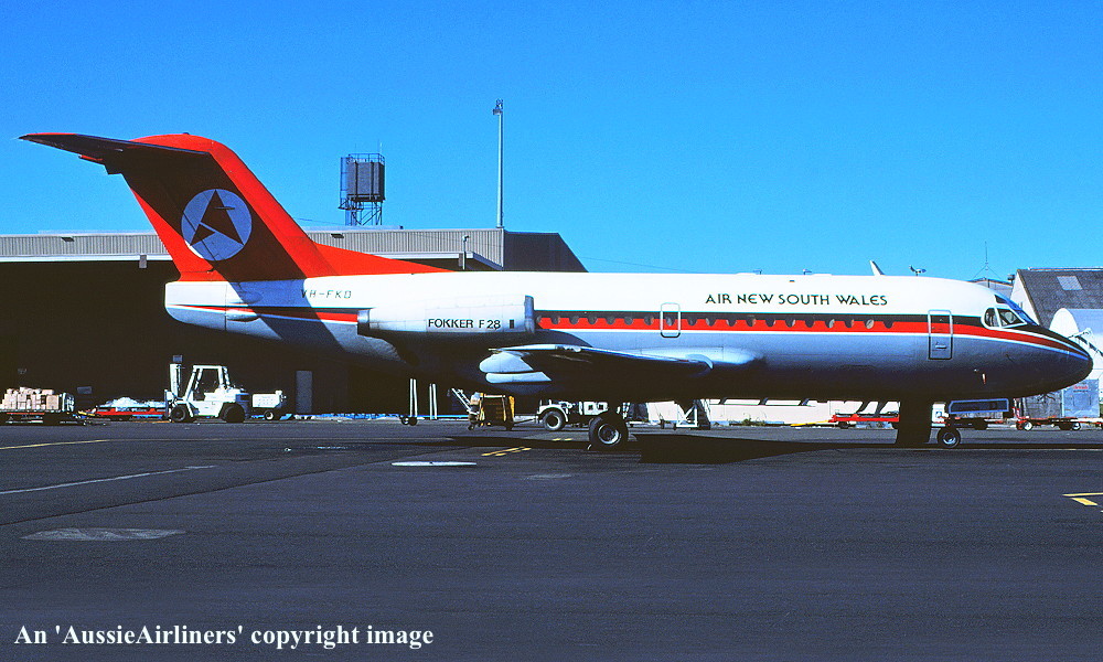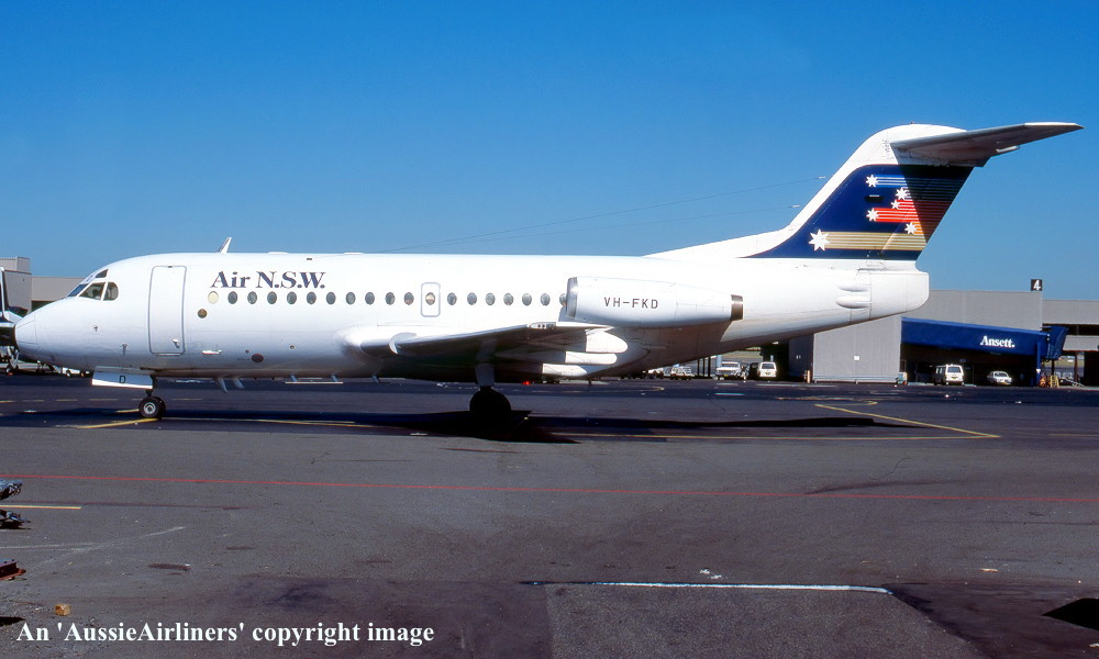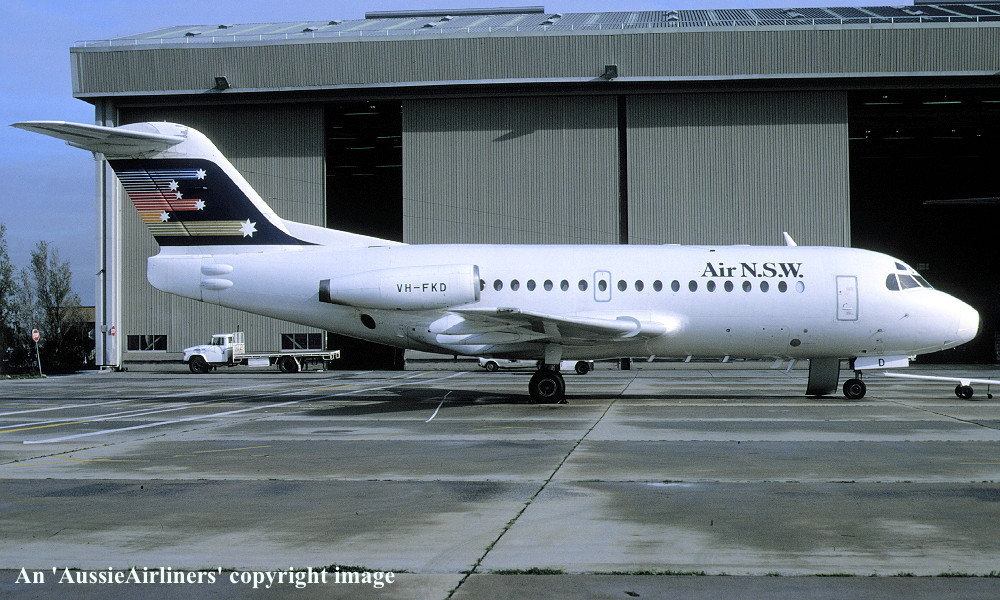 VH-FKD. Air N.S.W.. - in the 'Southern Cross' livery at Sydney Kingsford Smith Airport, January 10, 1986. (R. N. Smith Copyright Image 1995-261.) |