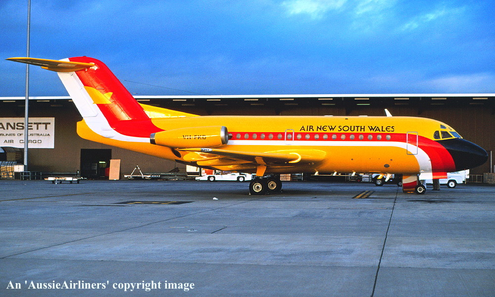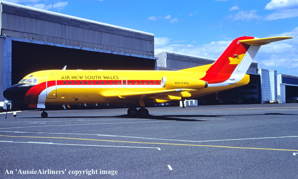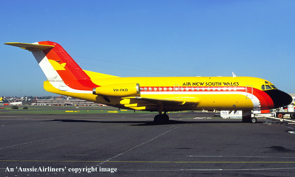VH-FKD. Air New South Wales - in the 'canary' livery at Sydney Kingsford Smith Airport, November 10, 1983. (R. N. Smith Copyright Image 1995-339.) |