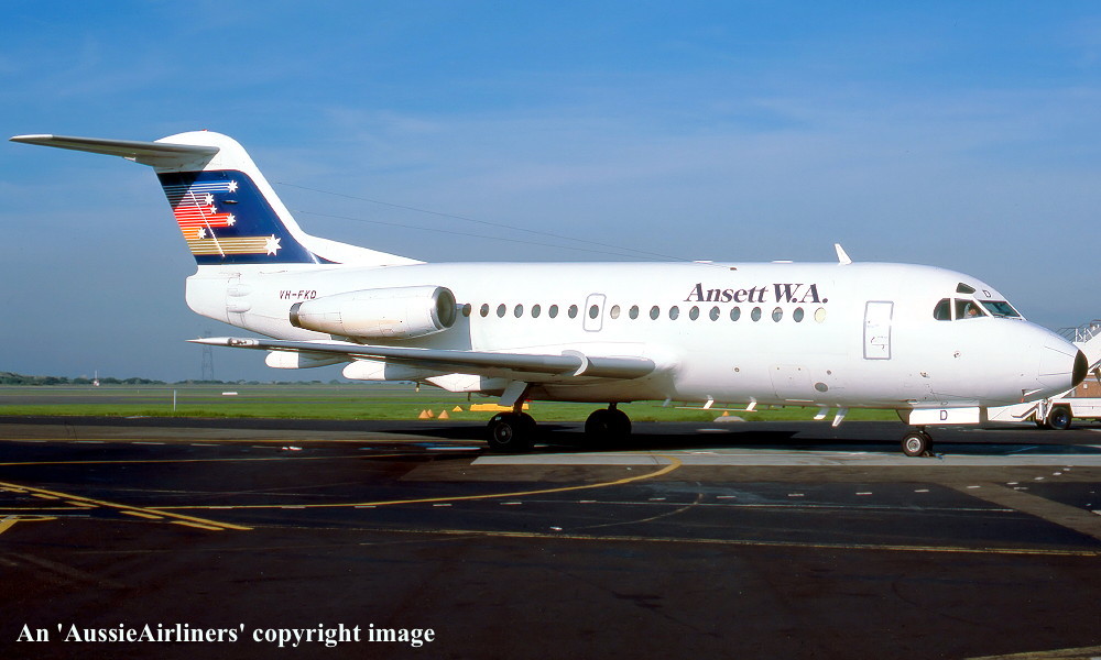 VH-FKD. Ansett W.A. - in the 'Southern Cross' livery at Melbourne Tullamarine Airport, May 1985. (R. N. Smith Collection Copyright Image 1995-510.) |