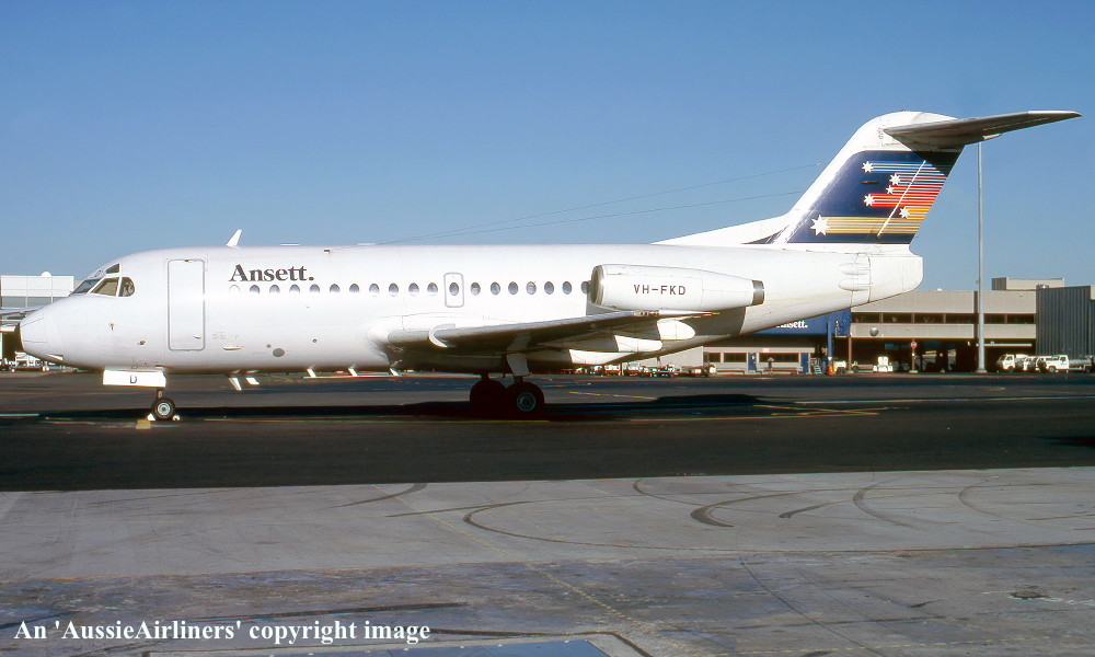 VH-FKD. Ansett - in the 'Southern Cross' livery at Sydney Kingsford Smith Airport, October 1990. (R. N. Smith Copyright Image 1995-262.) |